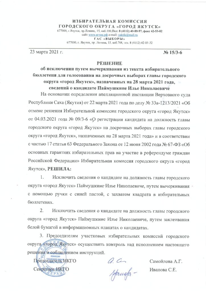 Решение №15/3-6 от 23.03.2021 об исключении путем вычеркивания из текста избирательного бюллетеня для голосования на досрочных выборах главы городского округа «город Якутск», назначенных на 28 марта 2021 года, сведений о кандидате Паймушкине Илье Николаевиче