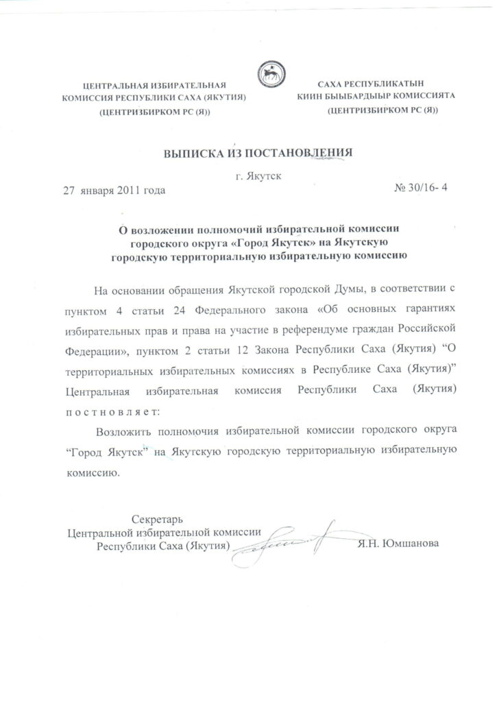 Главная → Законодательство → Местные выборы → О возложении полномочий избирательной комиссии городского округа "Город Якутск" на Якутскую городскую территориальную избирательную комиссию