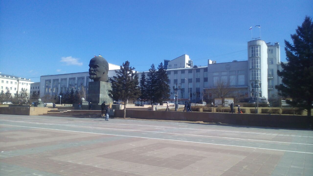 Участники автопробега по пешеходной “зеленая линия” начали с самой главной и известной достопримечательности города памятника В.И.Ленину. Это изображение головы вождя высотой 7.7 метра и весом 42 тонны находится на площади Советов. Это самая большая голова Ленина в мире. Далее экскурсия плавно переместилась к театру Оперы и балета. Этот театр – единственный оперный театр в Восточной Сибири и на Дальнем Востоке был построен в 1952.