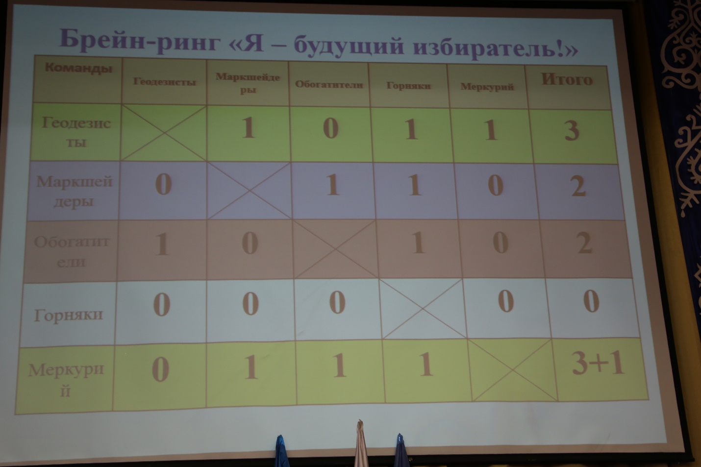 Жюри подвело итоги игры. По итогам 10 раундов команда “Обогатители” заняла III место. В финал вышли команды “Геодезисты” и “Меркурий”. В супер игре команде «Меркурий» (отделение подготовки маркшейдеров) удалось быстрее и правильнее ответить на финальные вопросы. Со счетом 1:3 победителем брейн-ринга стала команда “Меркурий” (капитан Федоров Иван).