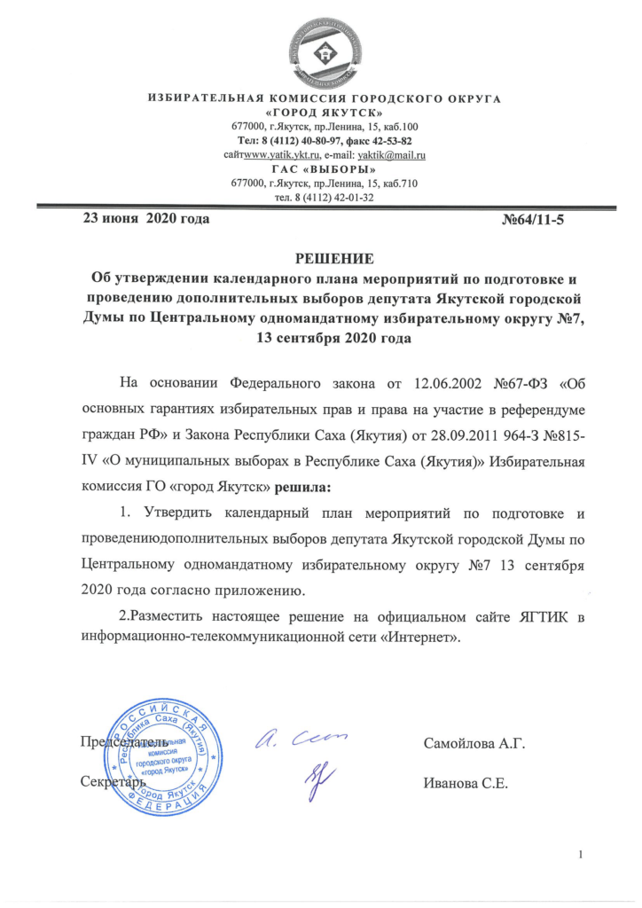 Главная → Законодательство → Решения ТИК/ИКГО → Об утверждении календарного плана мероприятий по подготовке и проведению дополнительных выборов депутата Якутской городской Думы по Центральному одномандатному избирательному округу №7
