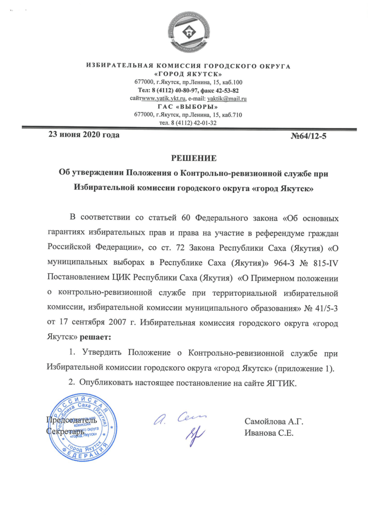 Главная → Законодательство → Решения ТИК/ИКГО → Об утверждении Положения о Контрольно-ревизионной службе при Избирательной комиссии городского округа "город Якутск"