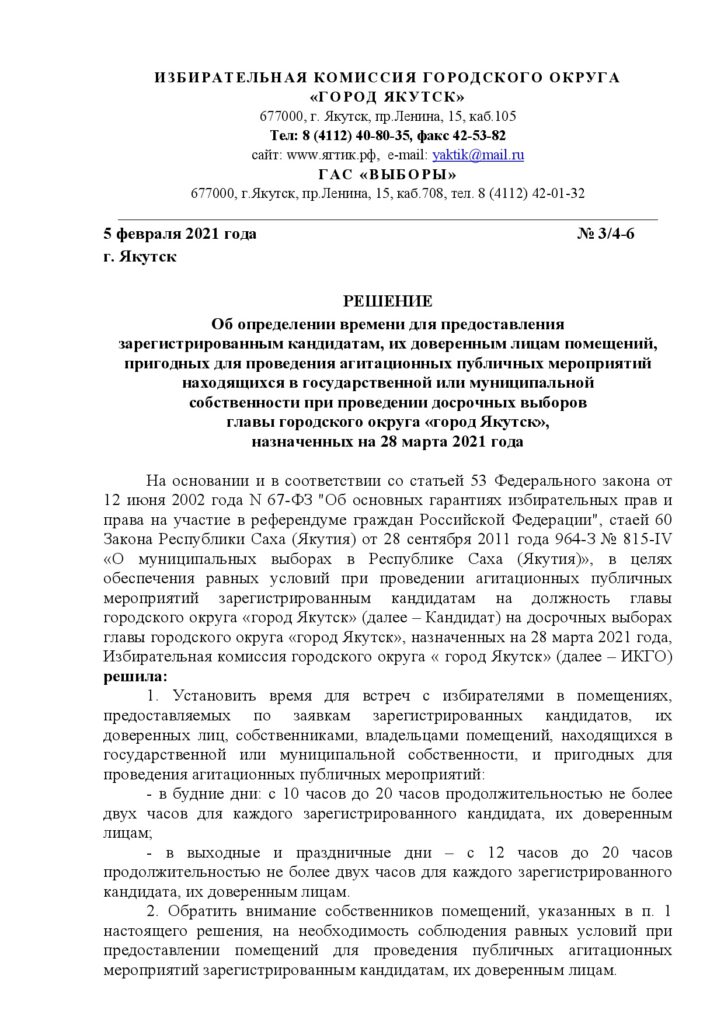 Об определении времени для предоставления зарегистрированным кандидатам, их доверенным лицам помещений, пригодных для проведения агитационных публичных мероприятий находящихся в государственной или муниципальной собственности при проведении досрочных выборов главы городского округа «город Якутск», назначенных на 28 марта 2021 года
