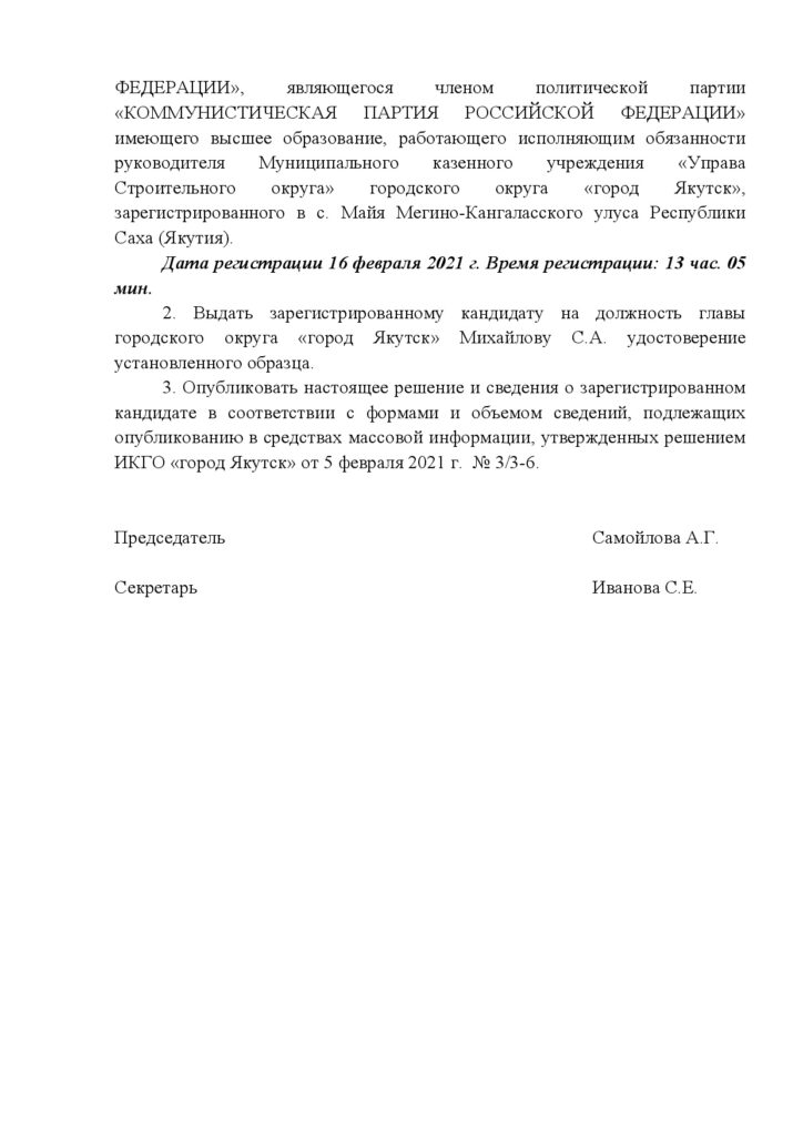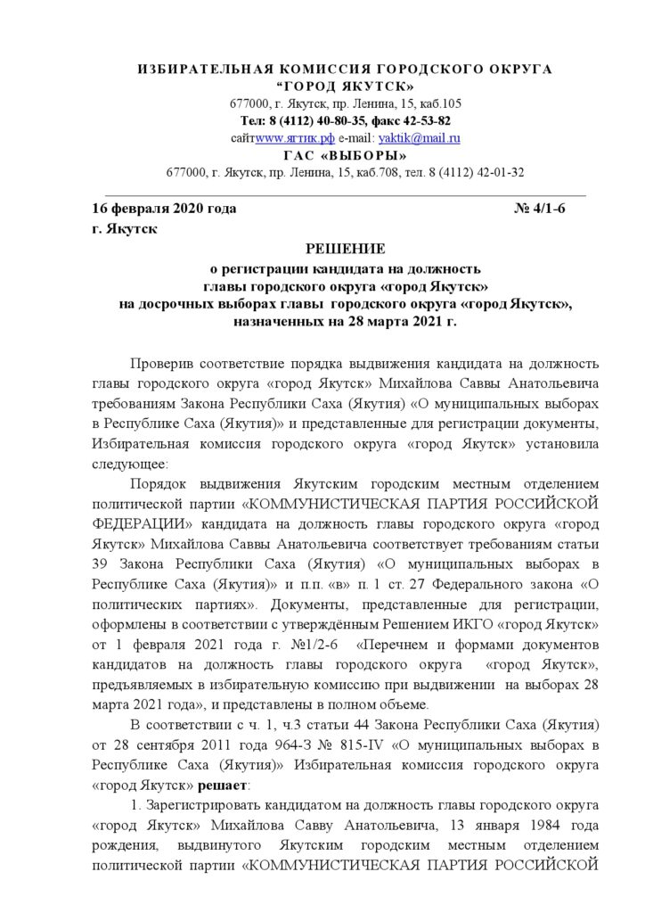 Главная → Новости → Решение о регистрации кандидата на должность главы городского округа «город Якутск» на досрочных выборах главы городского округа «город Якутск», назначенных на 28 марта 2021 г.
