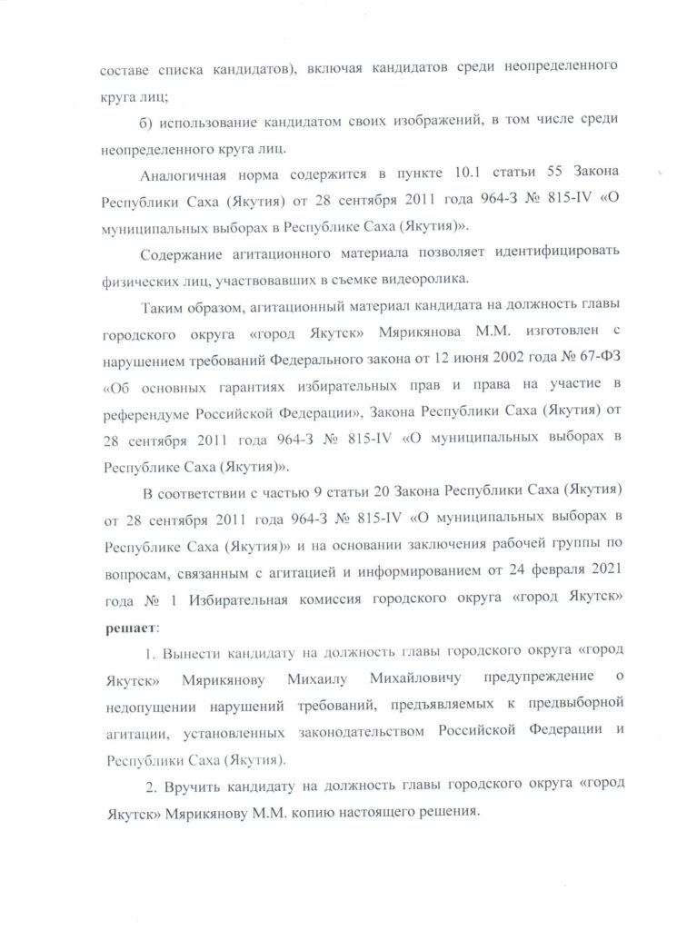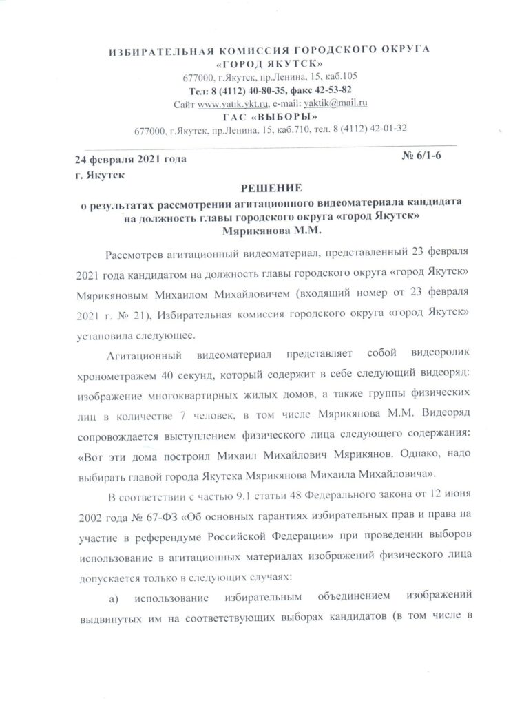 Решение о результатах рассмотрения агитационного видеоматериала кандидата на должность главы городского округа «город Якутск» Мярикянова М.М.