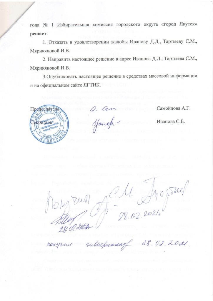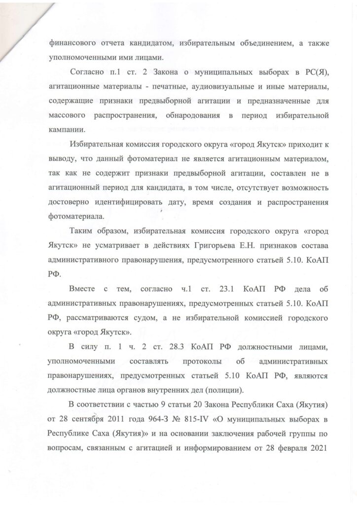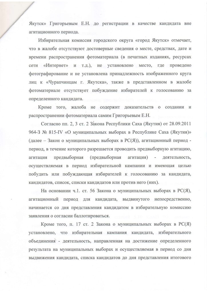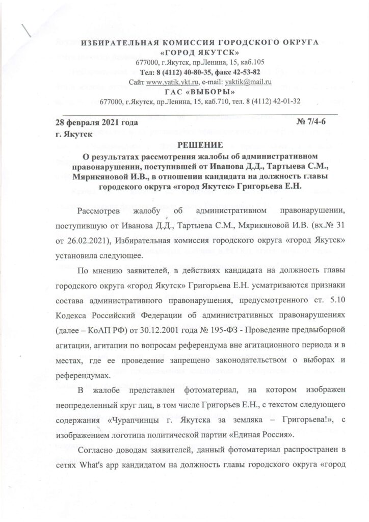 Главная → Новости → О результатах рассмотрения жалобы об административном правонарушении, поступившей от Иванова Д.Д., Тартыева С.М., Мярикяновой И.В., в отношении кандидата на должность главы городского округа Григорьева Е.Н.