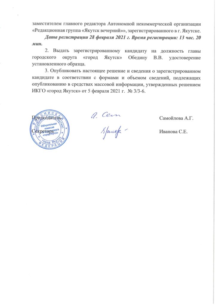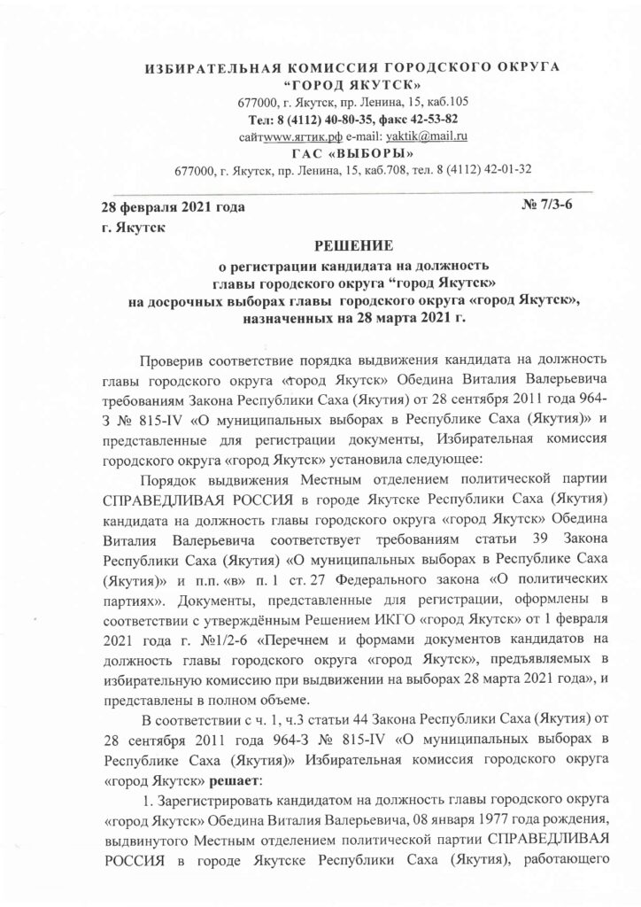 Главная → Новости → РЕШЕНИЕ №7/3-6 ОТ 28.02.2021 «О РЕГИСТРАЦИИ КАНДИДАТА НА ДОЛЖНОСТЬ ГЛАВЫ ГОРОДСКОГО ОКРУГА «ГОРОД ЯКУТСК» НА ДОСРОЧНЫХ ВЫБОРАХ ГЛАВЫ ГОРОДСКОГО ОКРУГА «ГОРОД ЯКУТСК»