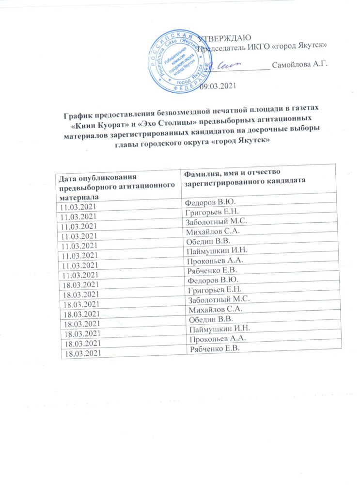 График предоставления безвозмездной печатной площади в газетах «Киин Куорат» и «Эхо Столицы» предвыборных агитационных материалов зарегистрированных кандидатов на досрочных выборах главы городского округа «город Якутск»