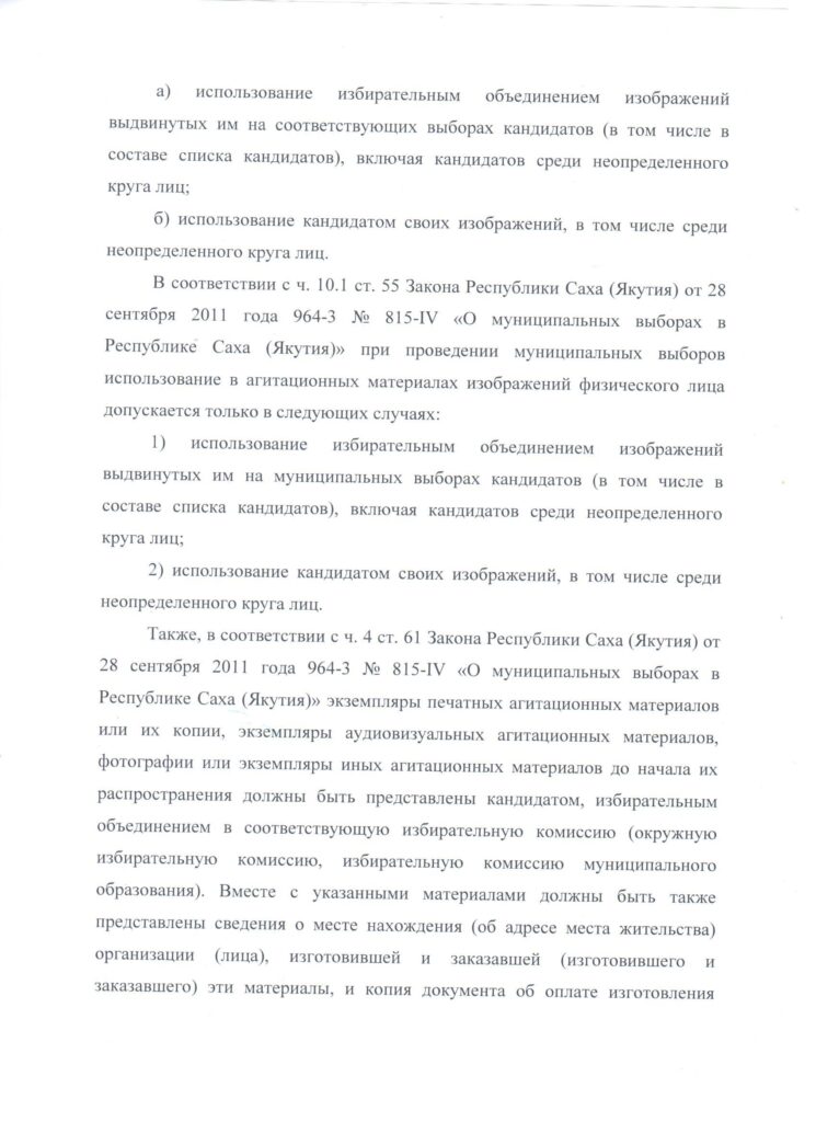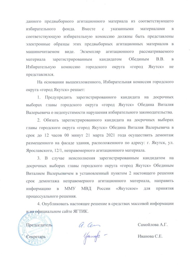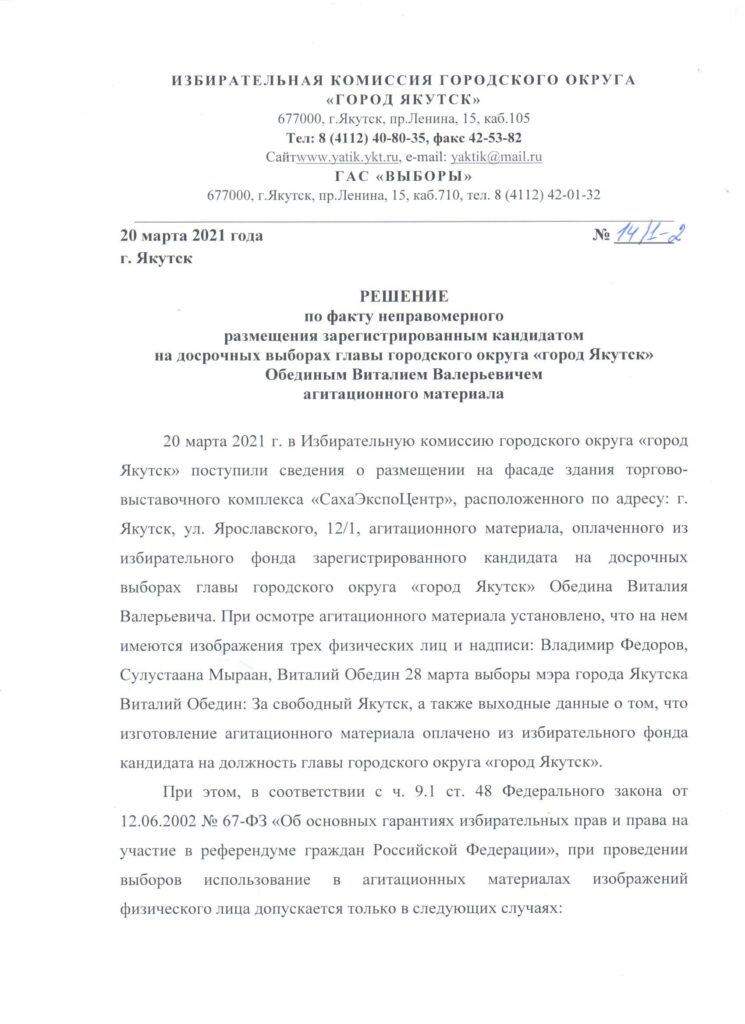 Решение №14/1-2 от 20.03.2021г. по факту неправомерного размещения зарегистрированным кандидатом на досрочных выборах главы городского округа «город Якутск» Обединым Виталием Валерьевичем агитационного материала