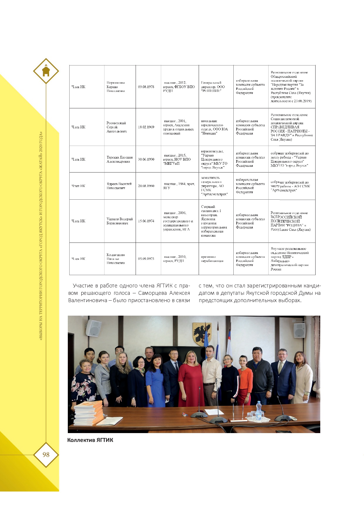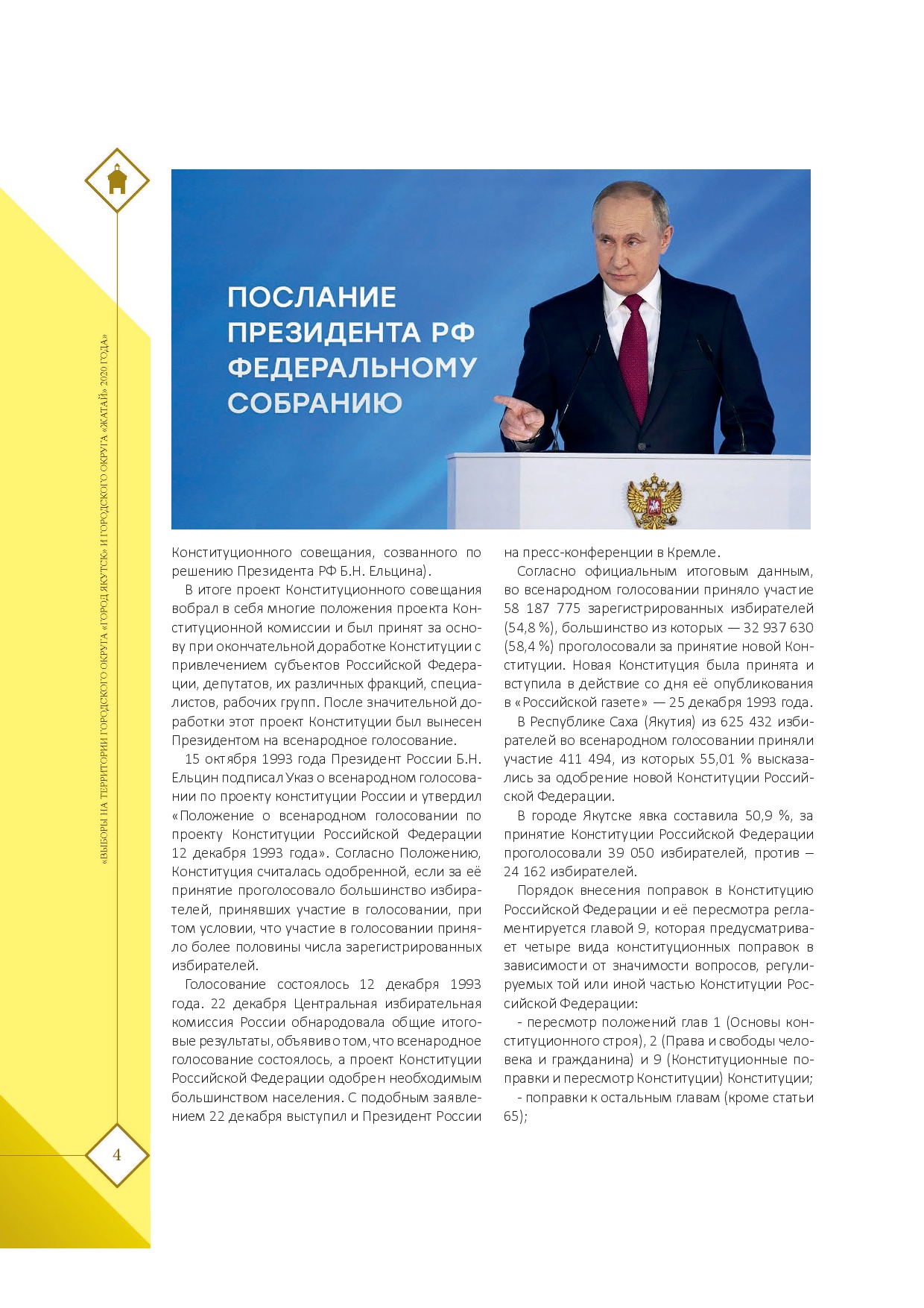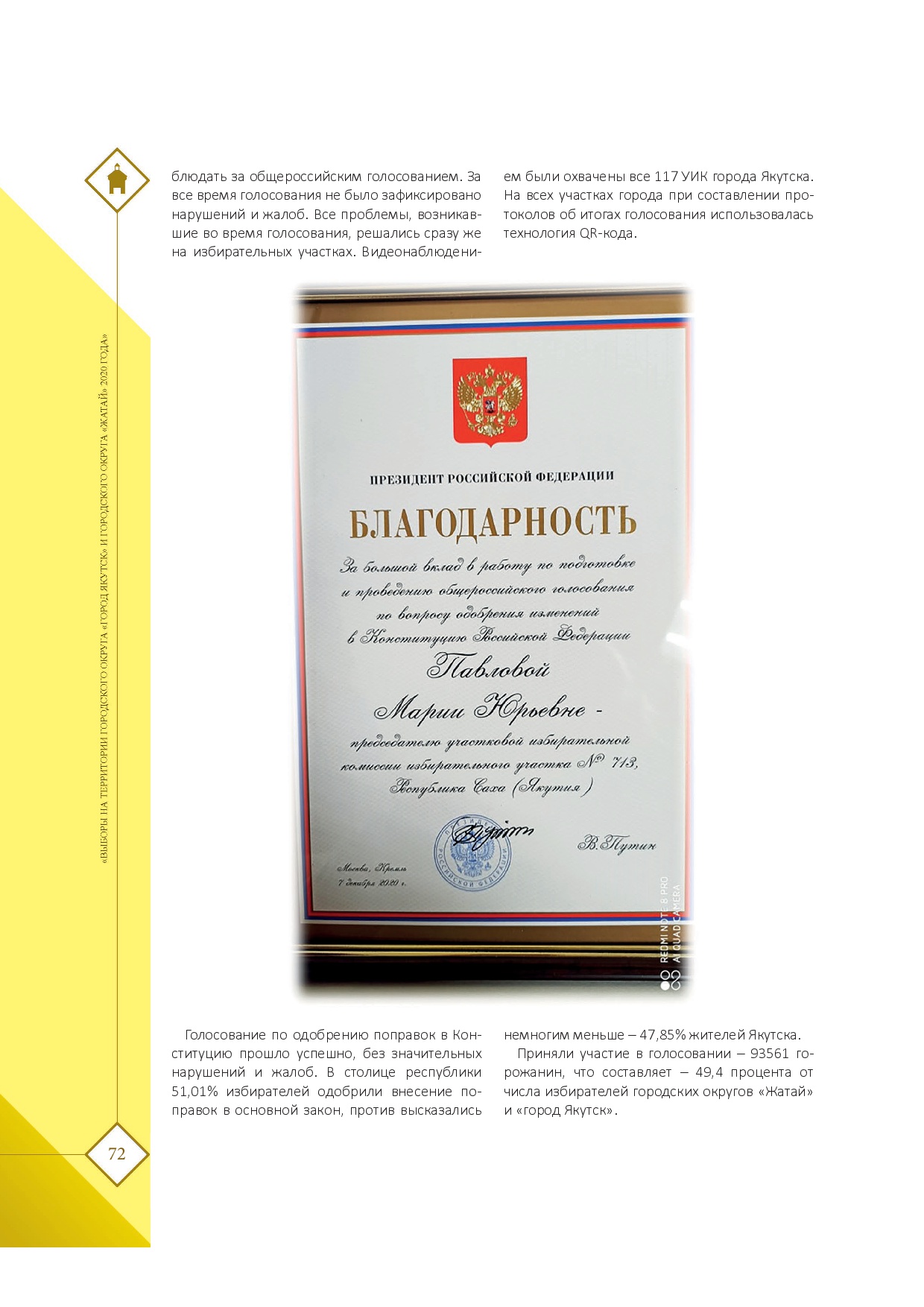 Очередной выпуск «Электорального справочника-2020» Якутской городской ТИК посвящен двум важным событиям, прошедшим на территории городских округов «город Якутск» и «Жатай»: Общероссийскому голосованию по вопросу одобрения изменений в Конституцию Российской Федерации, а также дополнительным выборам депутата Якутской городской Думы по Центральному одномандатному избирательному округу № 7.