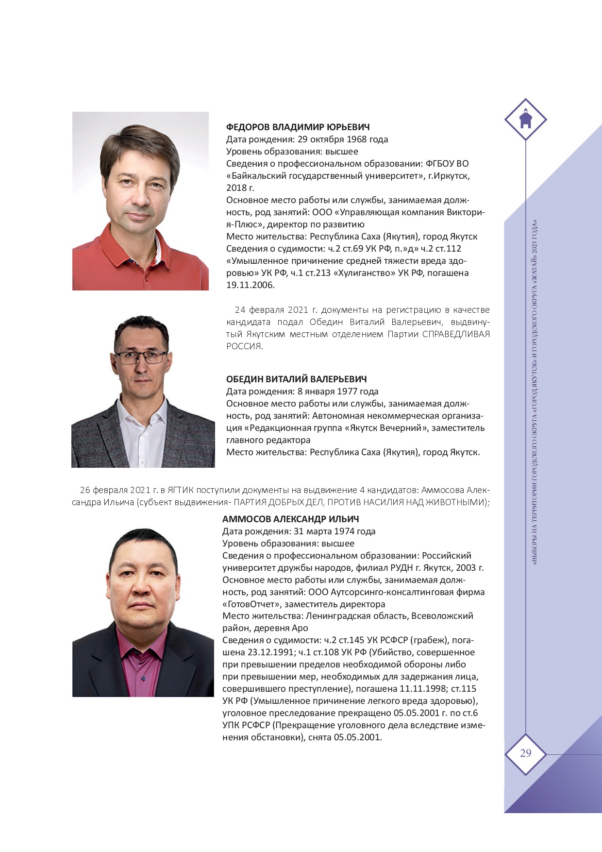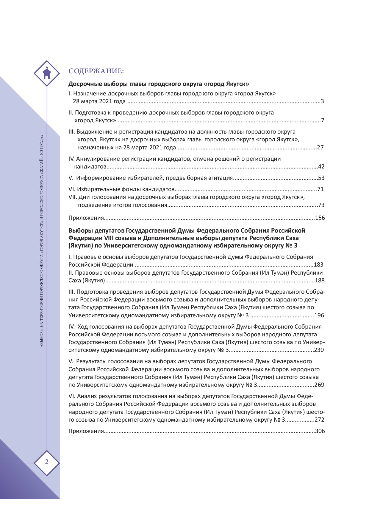 Очередной выпуск Электорального справочника г. Якутска посвящен избирательным кампаниям 2021 г.: досрочным выборам главы Городского округа «город Якутск» (28 марта 2021 г.) и выборам депутатов Государственной Думы Федерального Собрания Российской Федерации восьмого созыва и дополнительным выборам народного депутата Государственного Собрания (Ил Тумэн) Республики Саха (Якутия) шестого созыва по Университетскому одномандатному избирательному округу № 3. В справочнике представлены статистические и аналитические материалы, фотографии и биографические данные кандидатов, фотоотчеты участковых избирательных комиссий хода голосования.