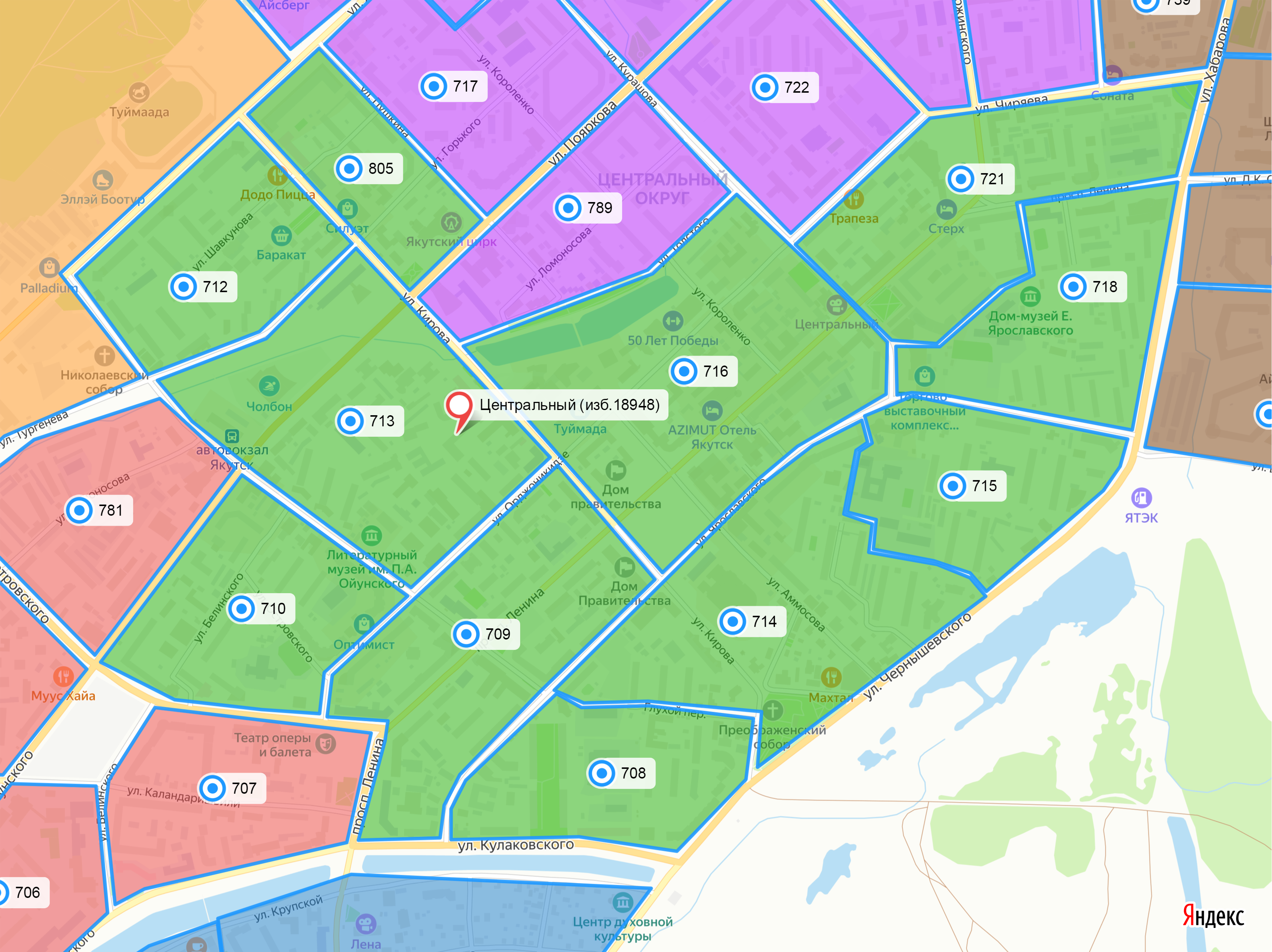 Границы округа: территория одномандатного избирательного округа включает в себя город Якутск в следующих границах: от улицы Чиряева по улице Хабарова до улицы Чернышевского, по улице Чернышевского до улицы Кулаковского, по улице Кулаковского до проспекта Ленина, по проспекту Ленина до улицы Петровского, по улице Петровского до улицы Ойунского, по улице Ойунского до улицы Октябрьской, по улице Октябрьской до улицы Лермонтова, по улице Лермонтова до улицы Пушкина, по улице Пушкина до улицы Пояркова, по улице Пояркова вдоль берега Талого озера до улицы Толстого, по улице Толстого до улицы Курашова, по улице Курашова до улицы Орджоникидзе, по улице Орджоникидзе до улицы Чиряева, по улице Чиряева до улицы Хабарова.