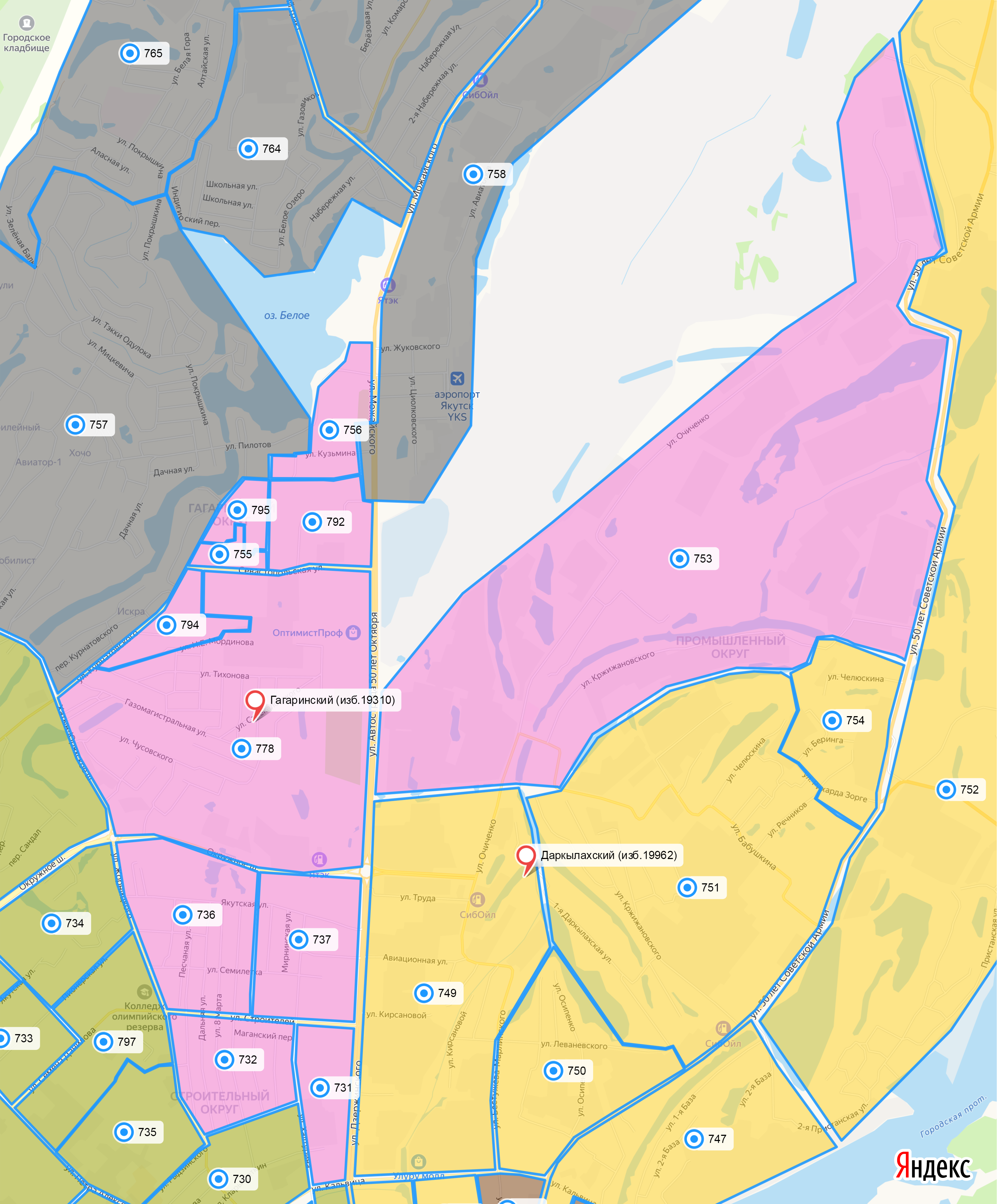 | Окружное | 1, 1/1, 2, 6, 7/1, 9/1, 11/1, 11/2, 15/1, 15/2, 20, 22, 23, 24, 25/4, 35, 37/1, 47, 47/1, 52 | 736 | ГБУ РС(Я) "Якутская база авиаохраны лесов" | город Якутск, улица Пионерская, дом 9 |