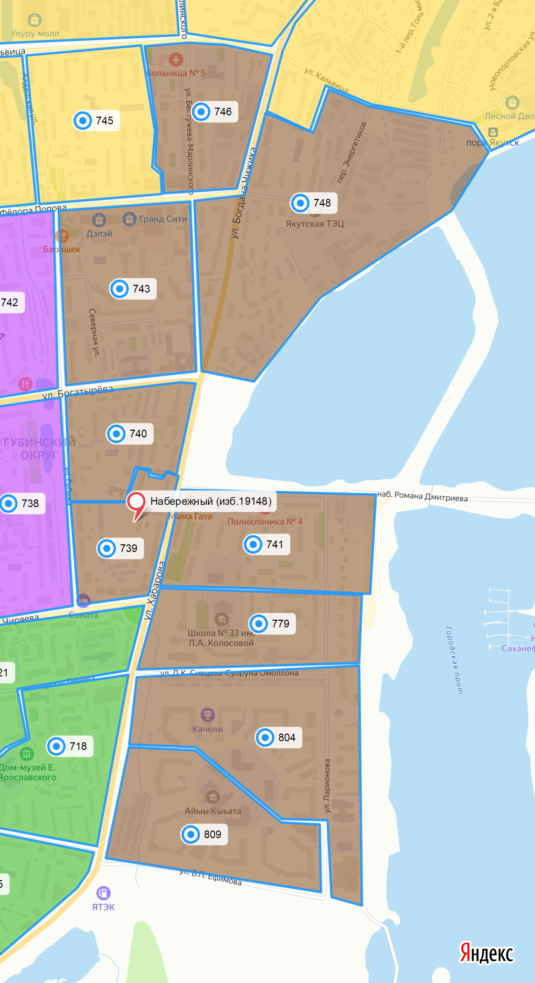 Границы округа: территория одномандатного избирательного округа включает в себя город Якутск в следующих границах: от улицы Чернышевского по улице В.П.Ефимова до улицы Ларионова, по улице Ларионова (с охватом домов 202 и 203 микрорайонов) до набережной Романа Дмитриева, от набережной Романа Дмитриева по городской протоке до Речного порта, по улице Новопортовской до улицы Кальвица, по улице Кальвица до улицы Богдана Чижика (исключая дома 20, 20/1 и 20/2 по улице Богдана Чижика), по улице Богдана Чижика до улицы Кальвица, по улице Кальвица до дома 5 (исключая его), по межквартальному проезду до улицы Федора Попова, по улице Федора Попова до улицы Губина, по улице Губина до улицы Чиряева, по улице Чиряева до улицы Хабарова, по улице Хабарова до улицы Чернышевского.