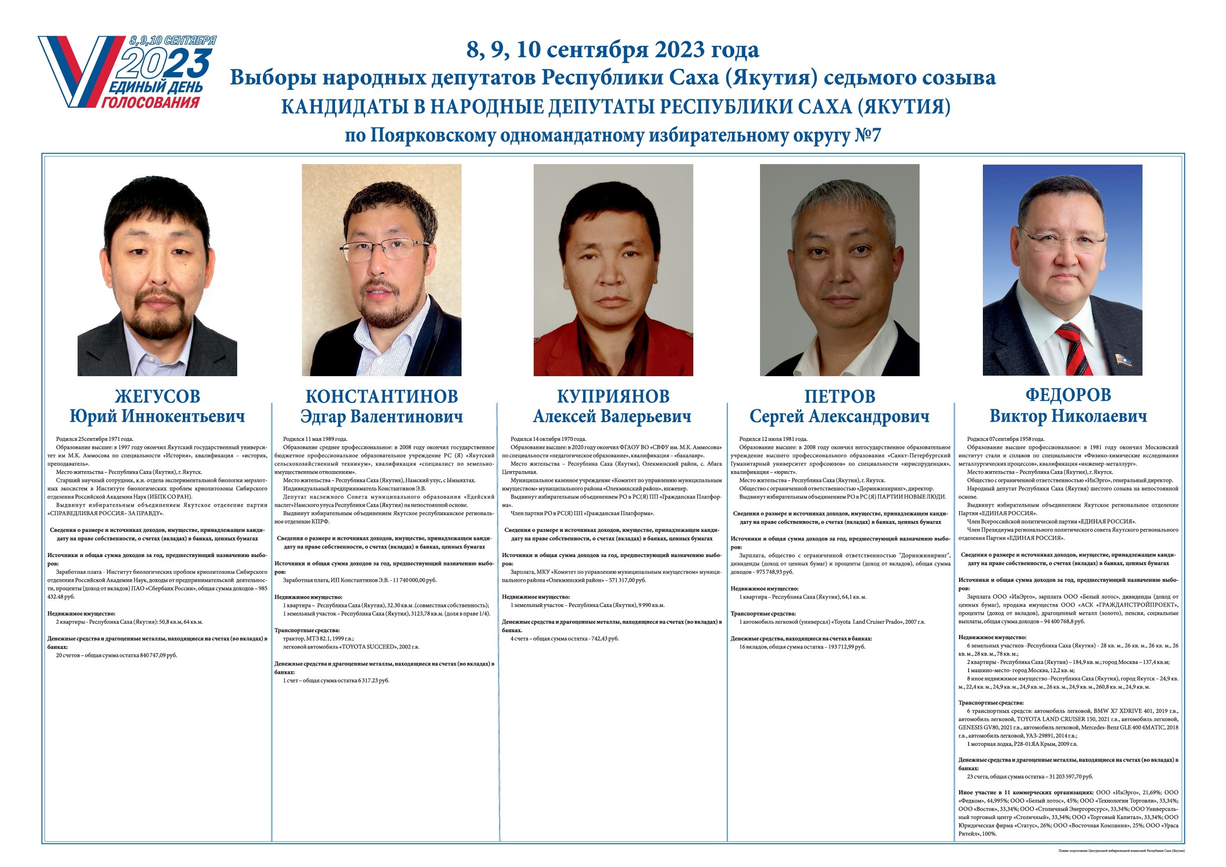 | 6 | ФЕДОРОВ ВИКТОР НИКОЛАЕВИЧ, дата рождения — 7 сентября 1958 года, уровень образования — высшее, основное место работы или службы, занимаемая должность, род занятий — ООО «ИнЭНЕРГО», генеральный директор, Государственное Собрание (Ил Тумэн) Республики Саха (Якутия), народный депутат Республики Саха (Якутия) на непостоянной основе, место жительства — Республика Саха (Якутия), город Якутск | член Всероссийской политической партии «ЕДИНАЯ РОССИЯ», член Регионального политического совета Якутского регионального отделения Партии «ЕДИНАЯ РОССИЯ», член Президиума Регионального политического совета Якутского регионального отделения Партии «ЕДИНАЯ РОССИЯ», член Местного политического совета Якутского местного отделения Партии «ЕДИНАЯ РОССИЯ», секретарь Якутского местного отделения Партии «ЕДИНАЯ РОССИЯ». | ЯКУТСКОЕ РЕГИОНАЛЬНОЕ ОТДЕЛЕНИЕ ПАРТИИ «ЕДИНАЯ РОССИЯ» | 07.07.2023 | п.п.3-7 ст.35.1 ФЗ «Об основных гарантиях…» № 67-ФЗ | зарег.