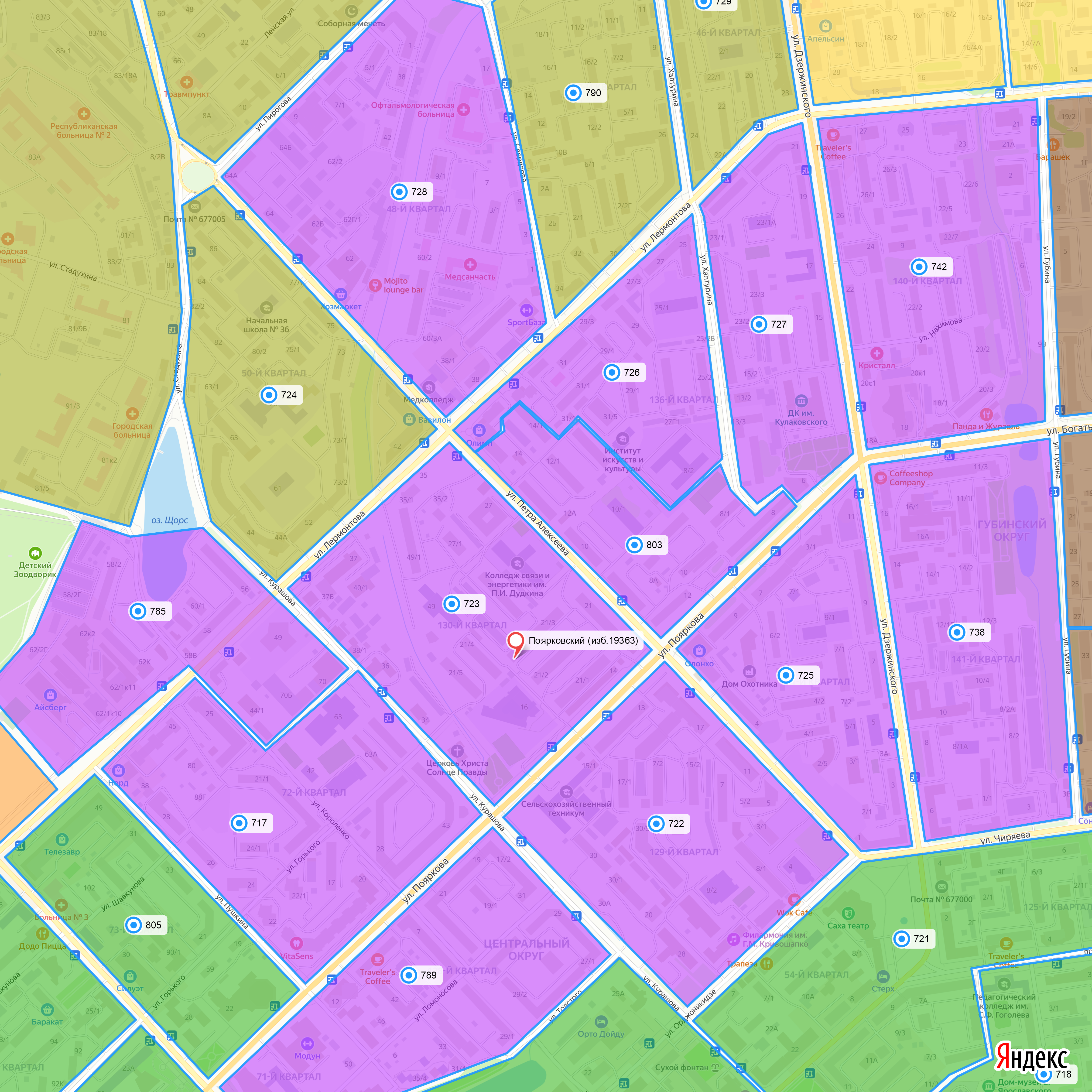 Границы округа: территория одномандатного избирательного округа включает в себя город Якутск в следующих границах: от улицы Федора Попова по улице Губина до улицы Чиряева, по улице Чиряева до улицы Орджоникидзе, по улице Орджоникидзе до улицы Курашова, по улице Курашова до улицы Толстого, от улицы Толстого вдоль берега Талого озера до улицы Кирова, по улице Кирова до улицы Пояркова, по улице Пояркова до улицы Пушкина, по улице Пушкина до улицы Лермонтова, по улице Лермонтова до Комсомольской площади, от Комсомольской площади по внешней границе МАУ «Парк культуры и отдыха» и территории Республиканской больницы до улицы Курашова, по улице Курашова до улицы Лермонтова, по улице Лермонтова до улицы Петра Алексеева, по улице Петра Алексеева до улицы Пирогова, по улице Пирогова до улицы Свердлова, по улице Свердлова до улицы Лермонтова, по улице Лермонтова до улицы Федора Попова, по улице Федора Попова до улицы Губина.