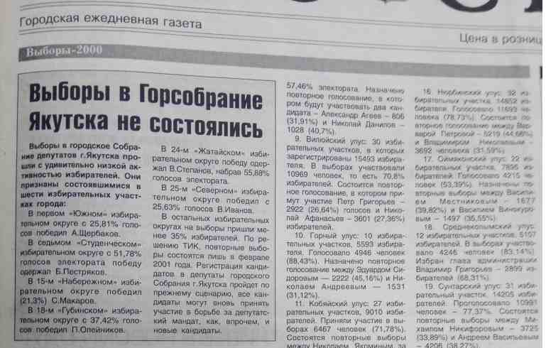 В ноябре 2000 года на Выборах депутатов городского Собрания депутатов г.Якутска 2-го созыва из 25 избирательных округов выборы состоялись лишь в шести: