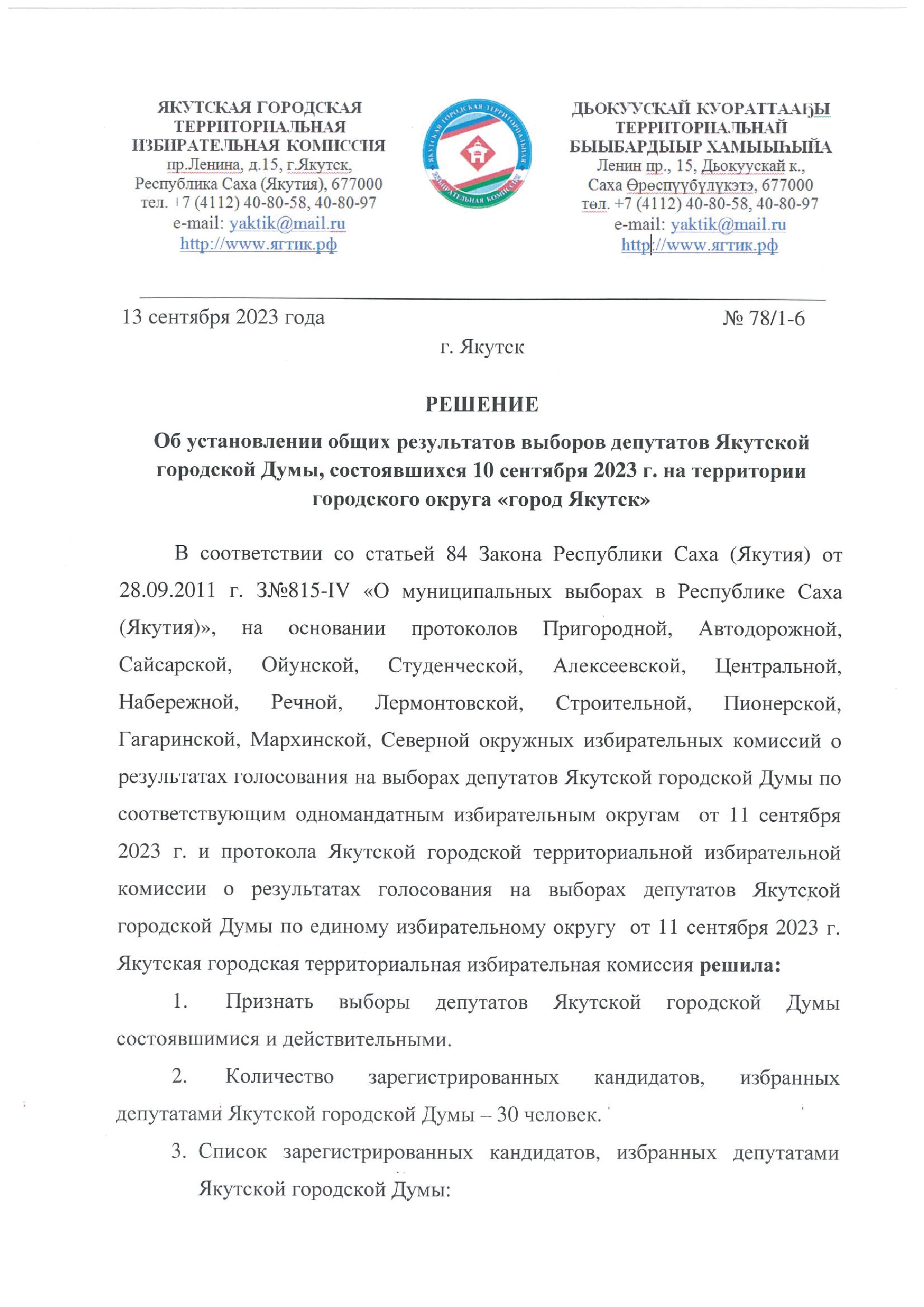 Решение об установлении общих результатов выборов депутатов Якутской городской Думы, состоявшихся 10 сентября 2023 года на территории городского округа «город Якутск»