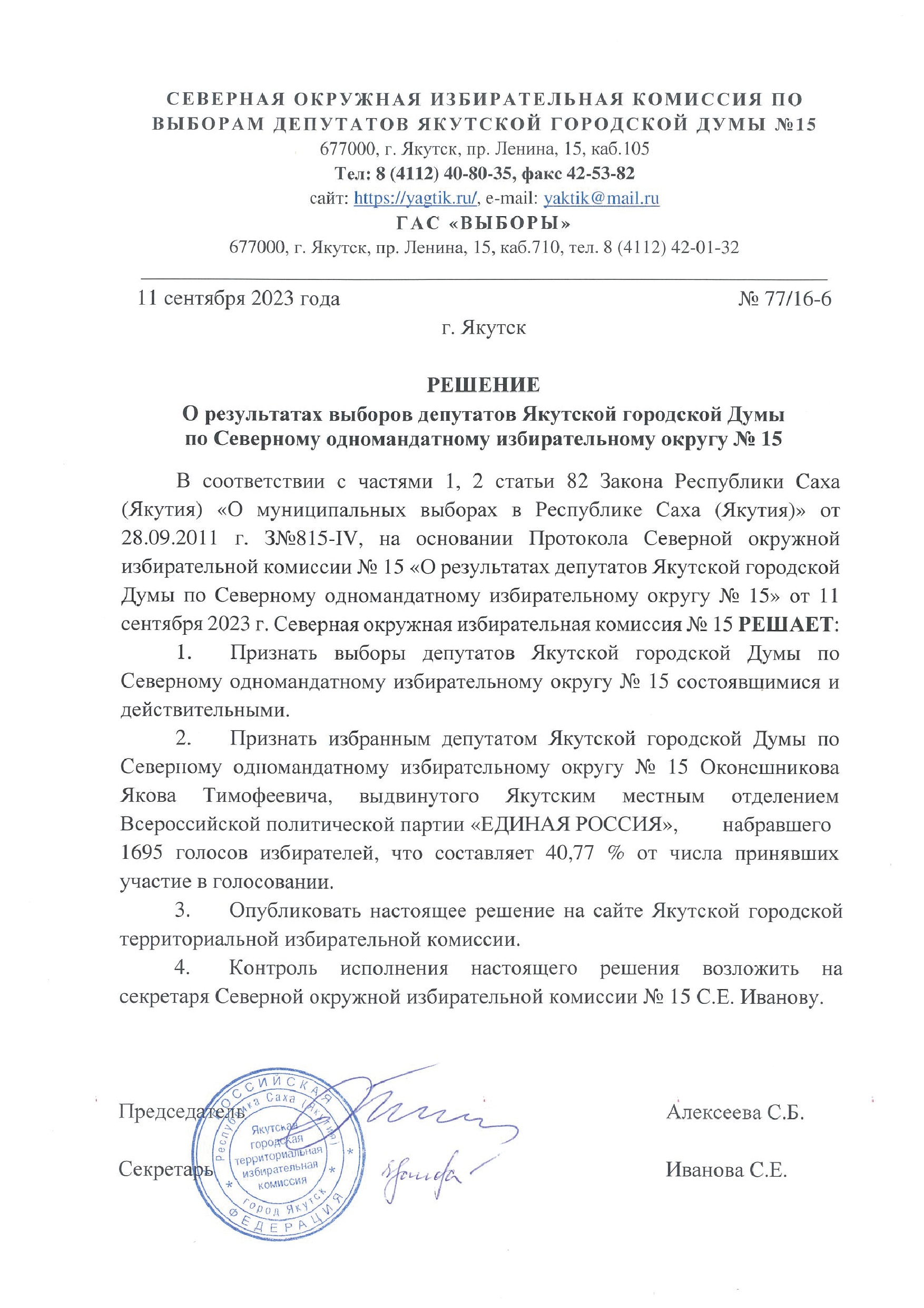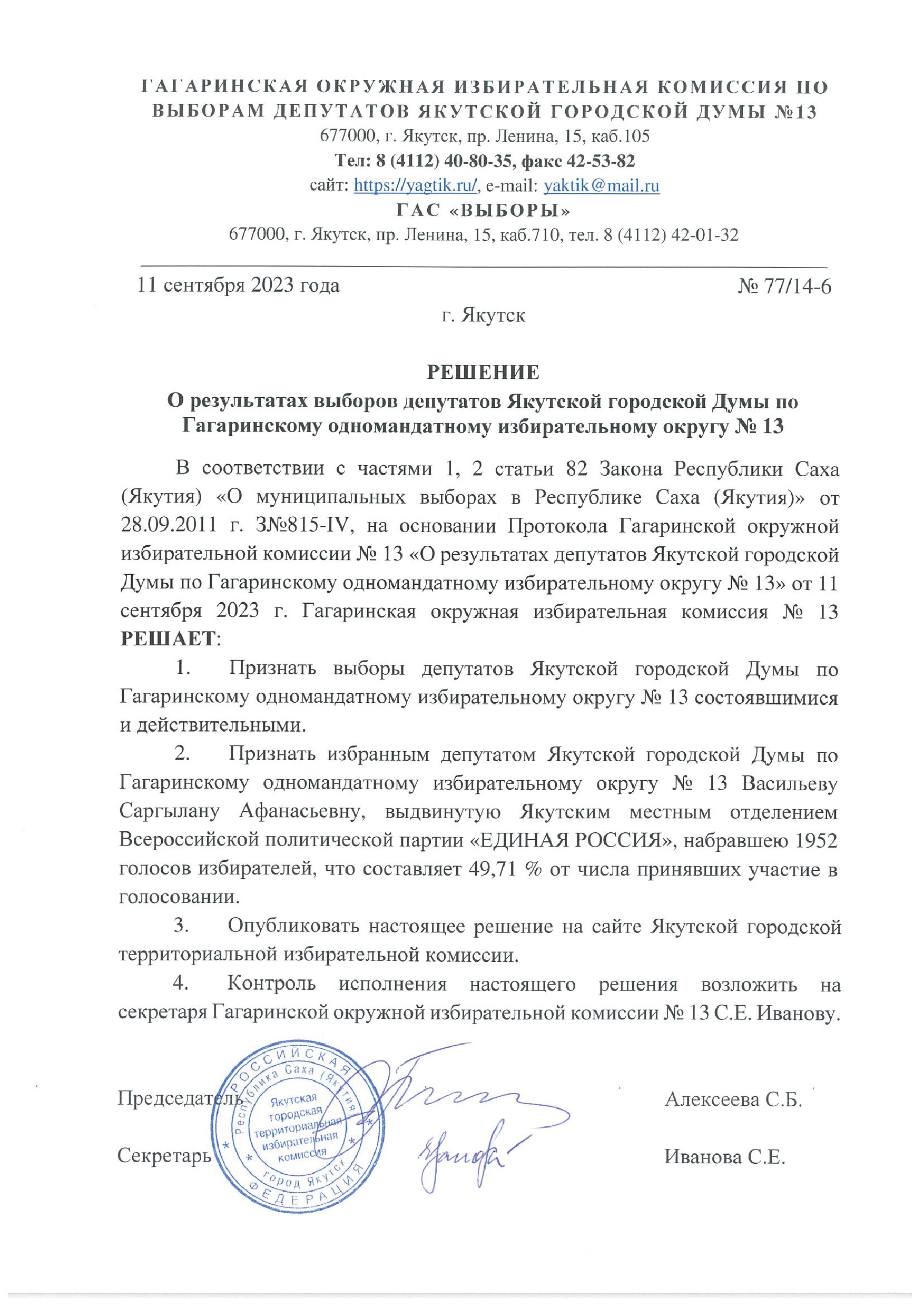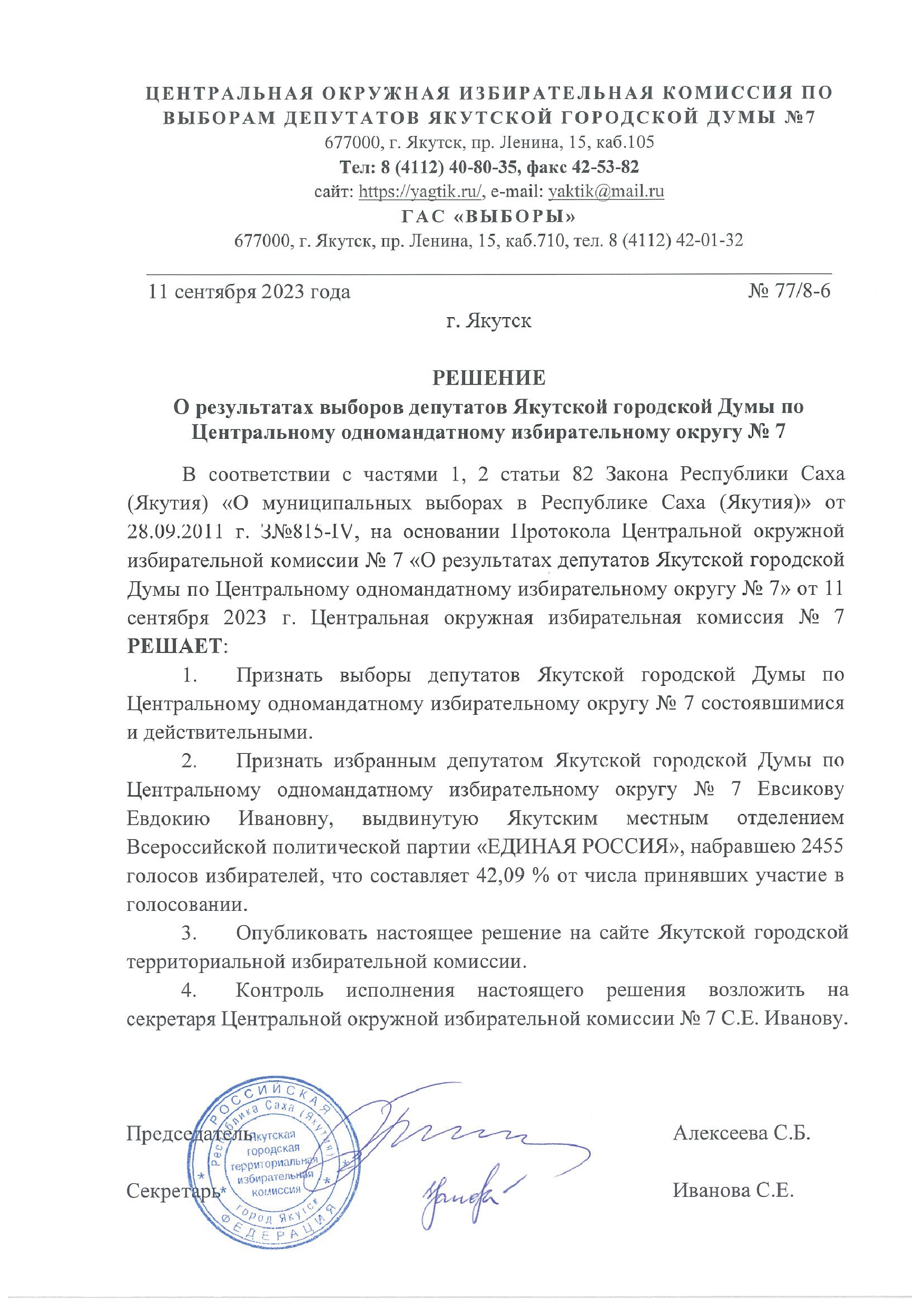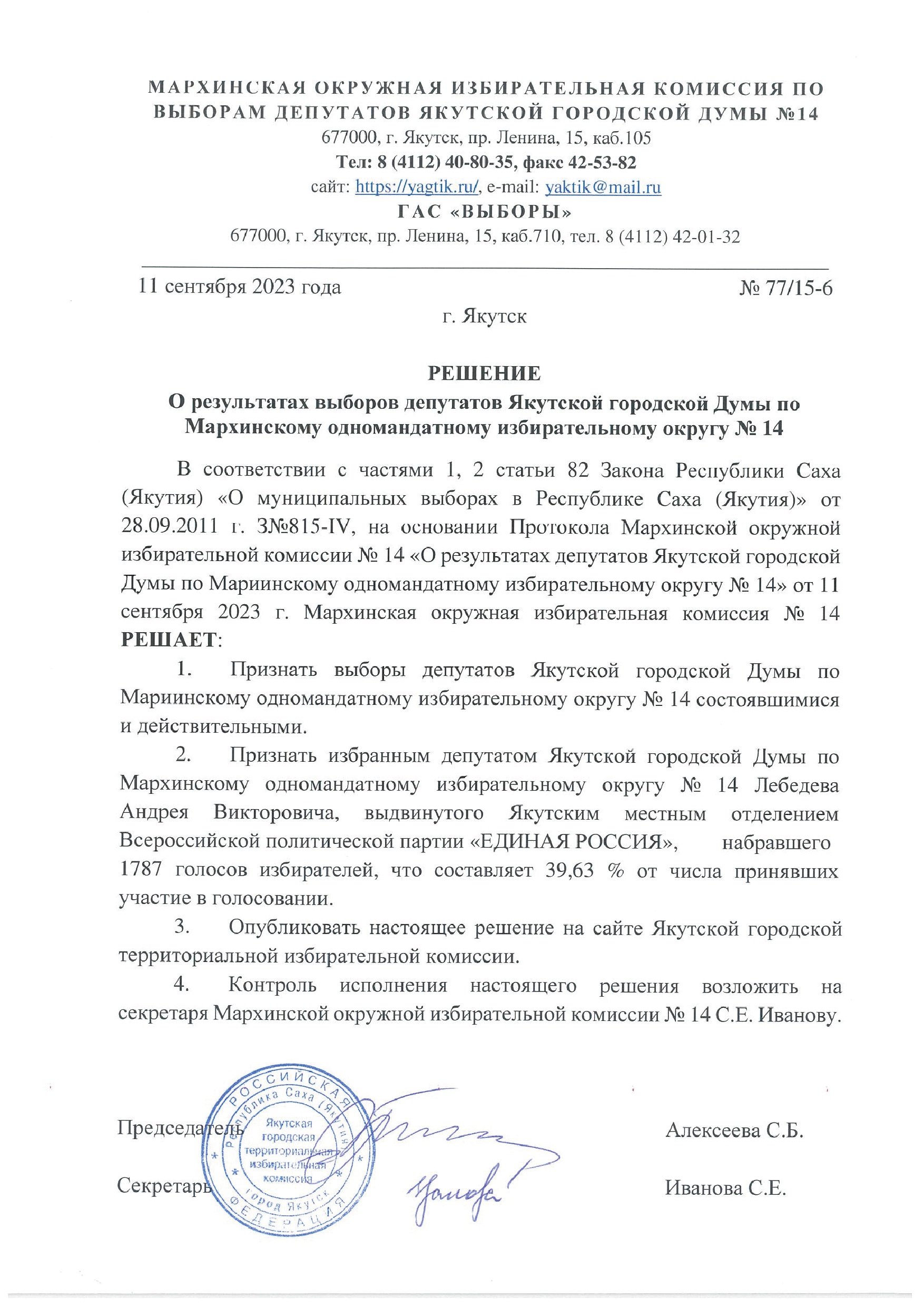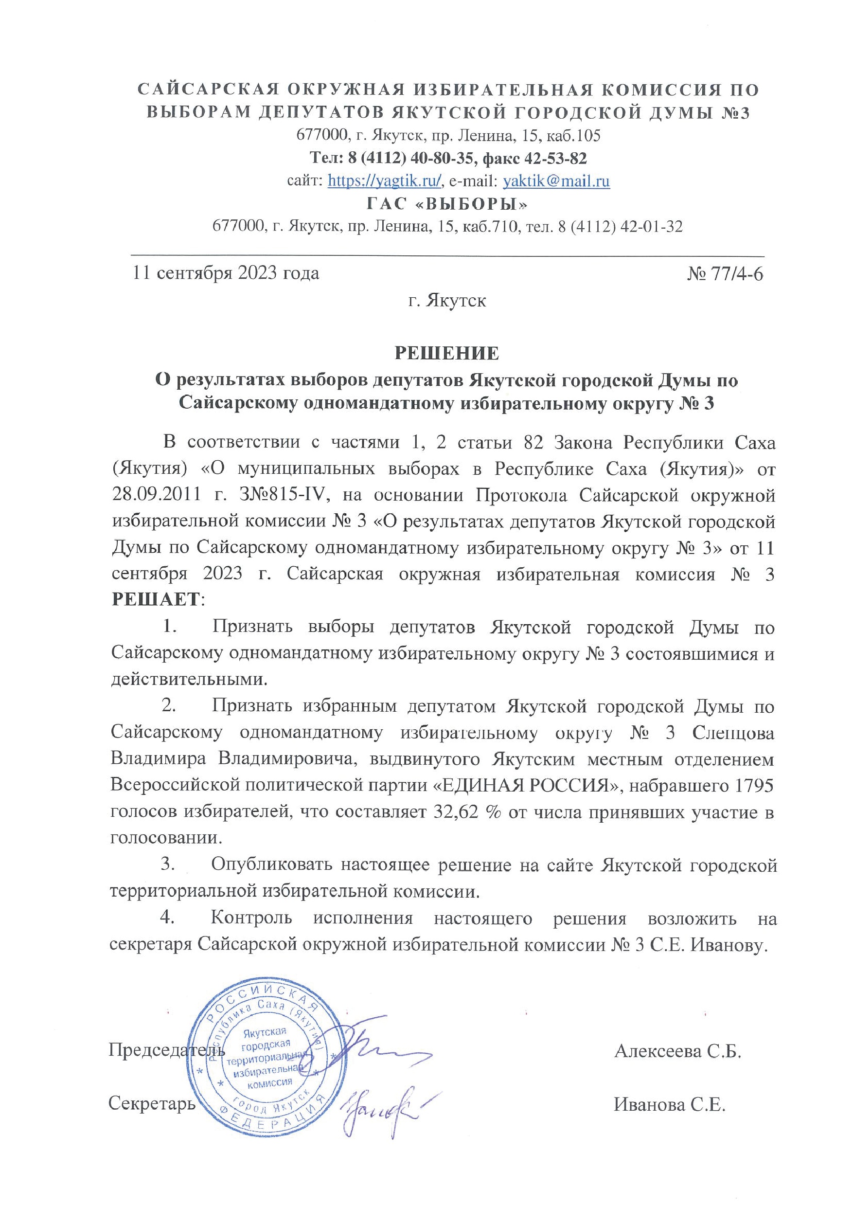 Решения о результатах выборов депутатов Якутской городской Думы по одномандатным избирательным округам