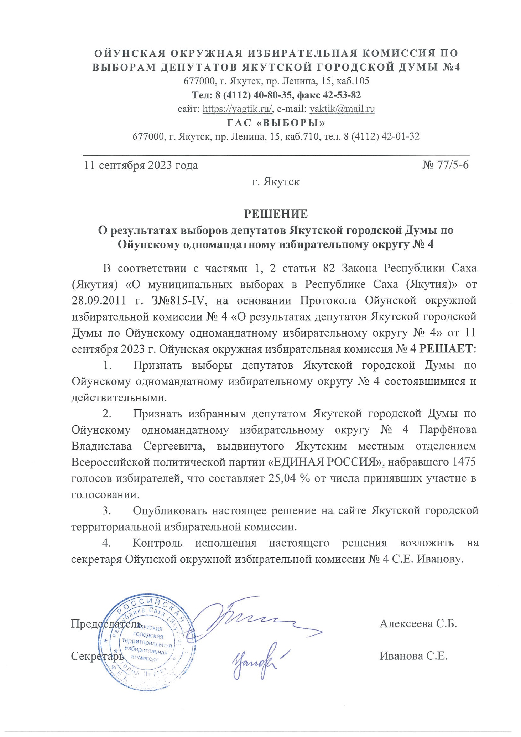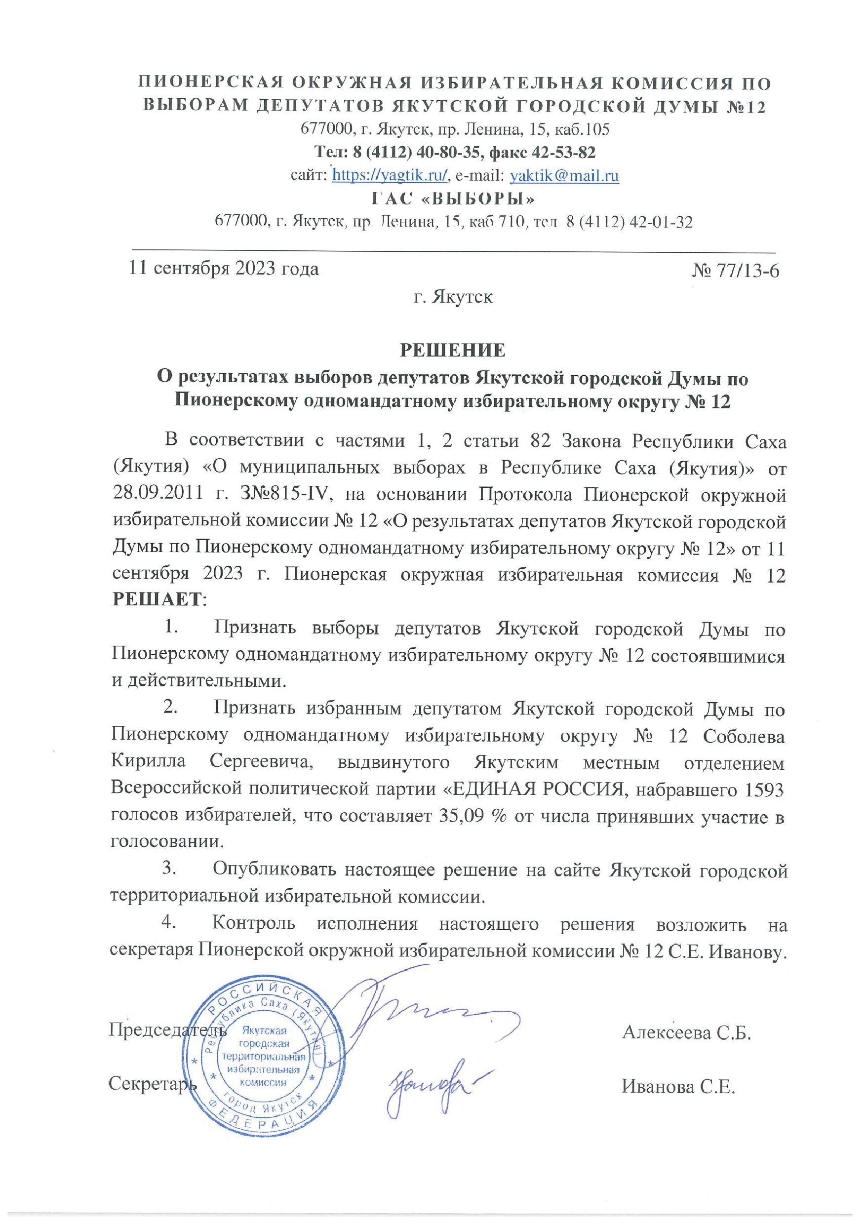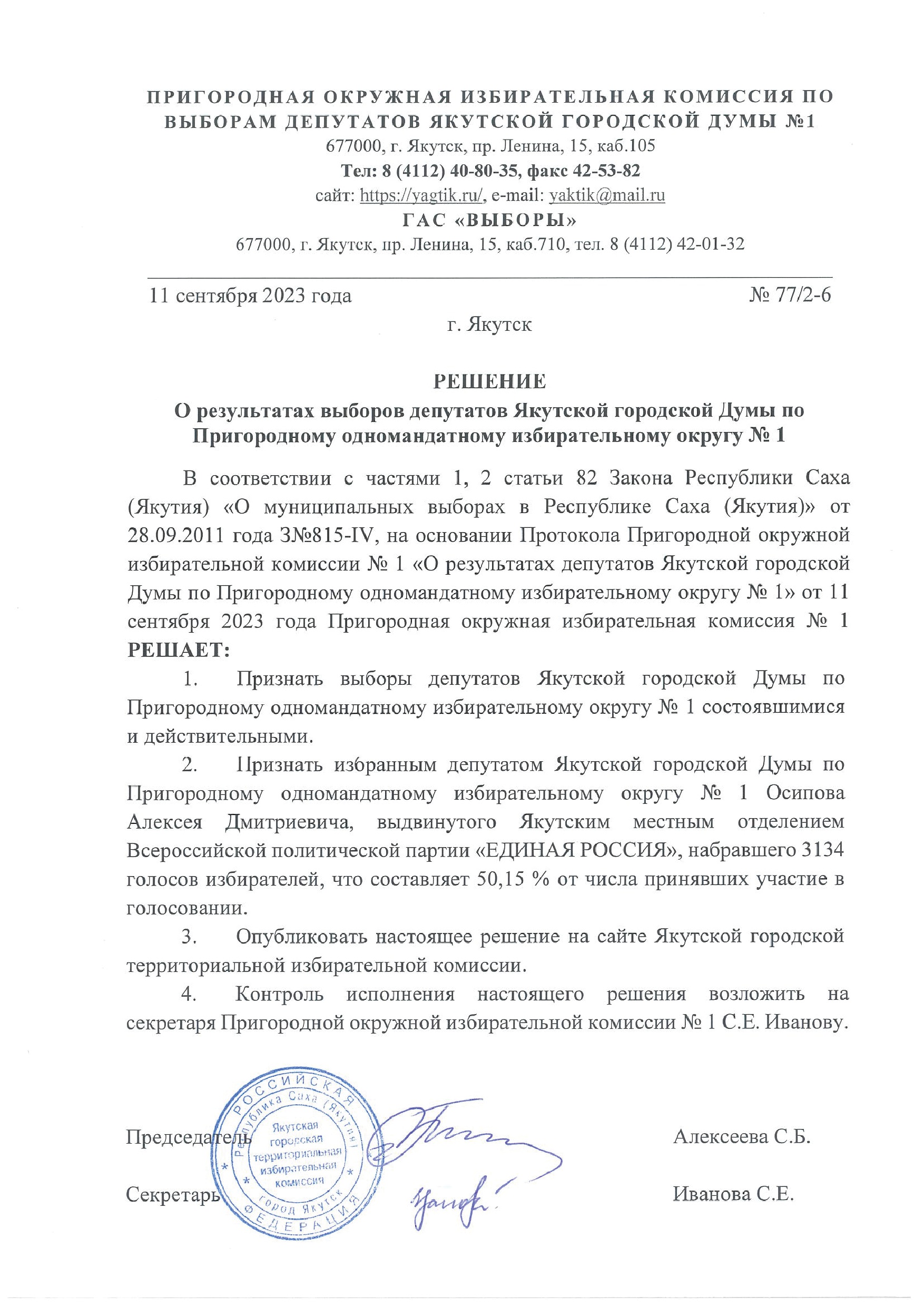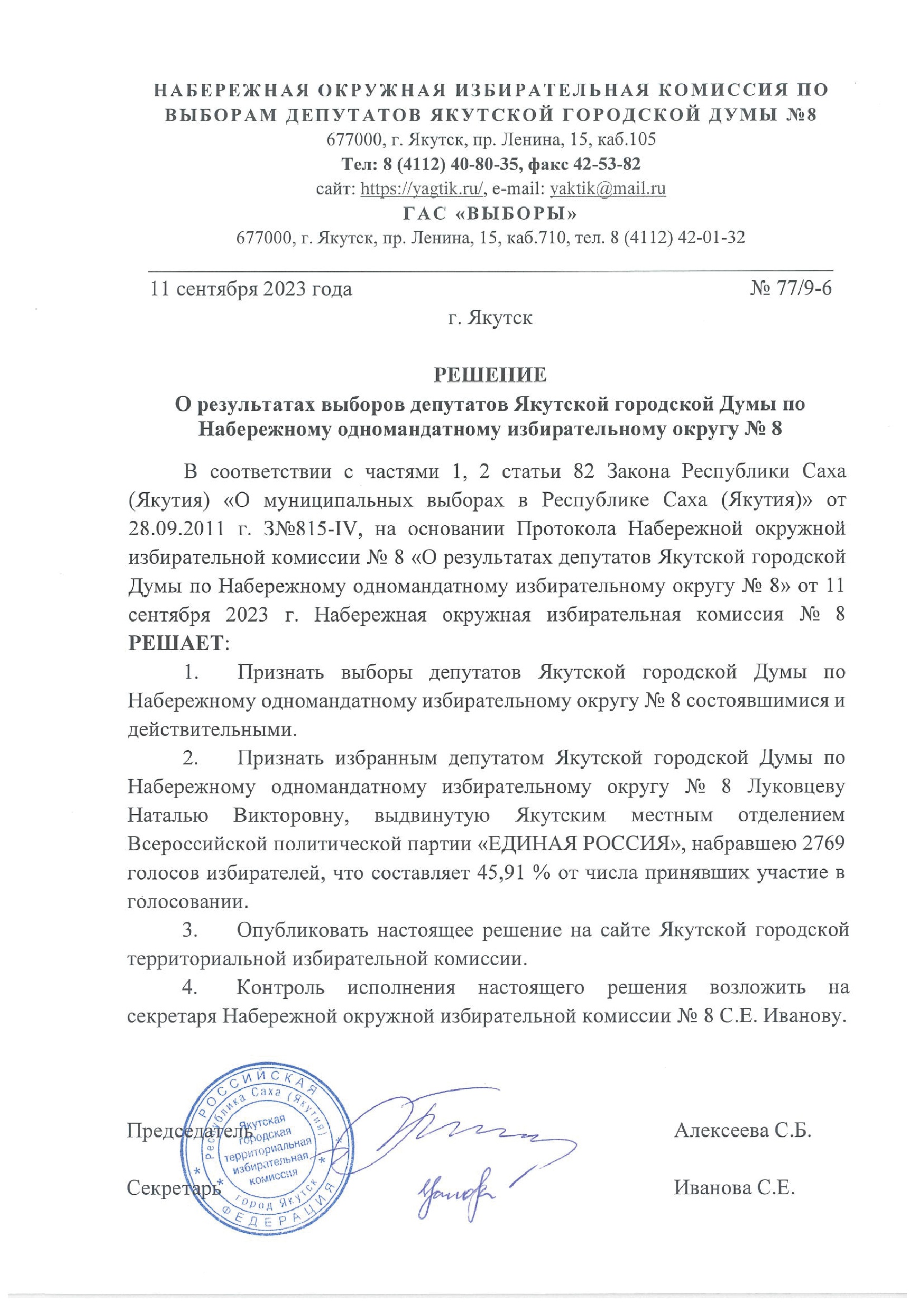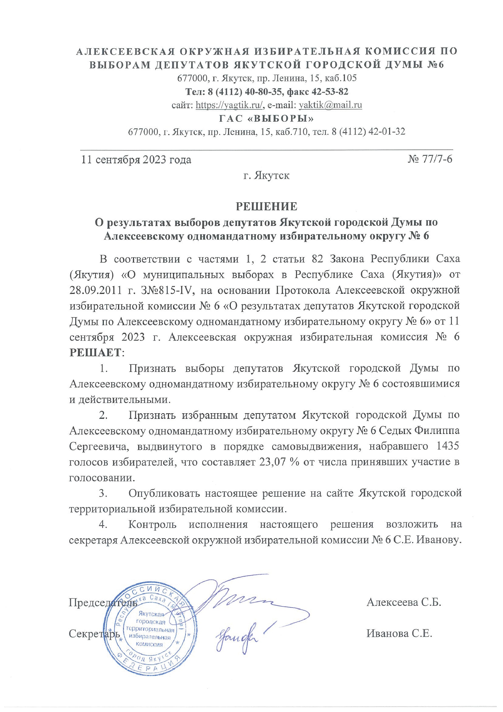 Решения о результатах выборов депутатов Якутской городской Думы по одномандатным избирательным округам