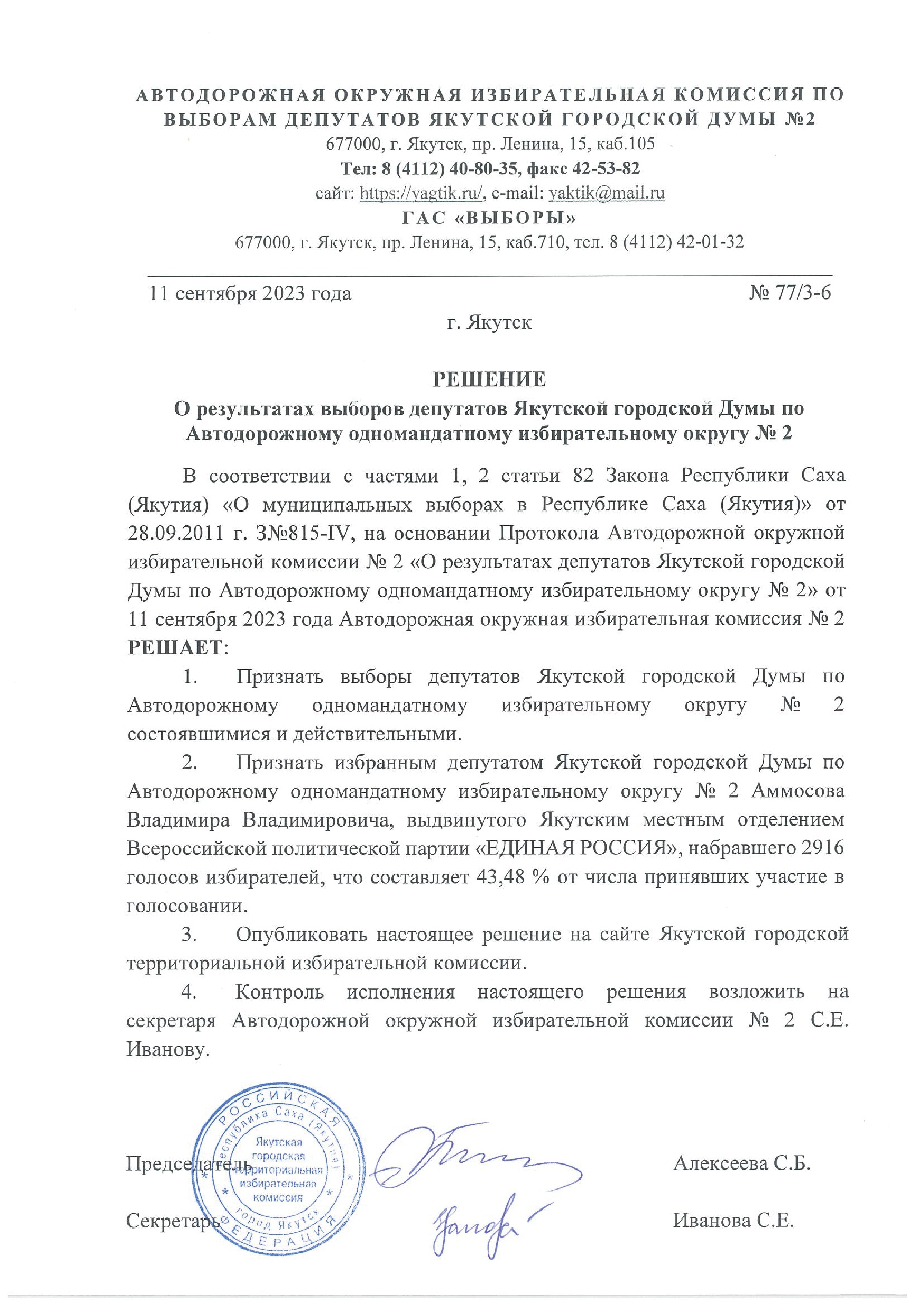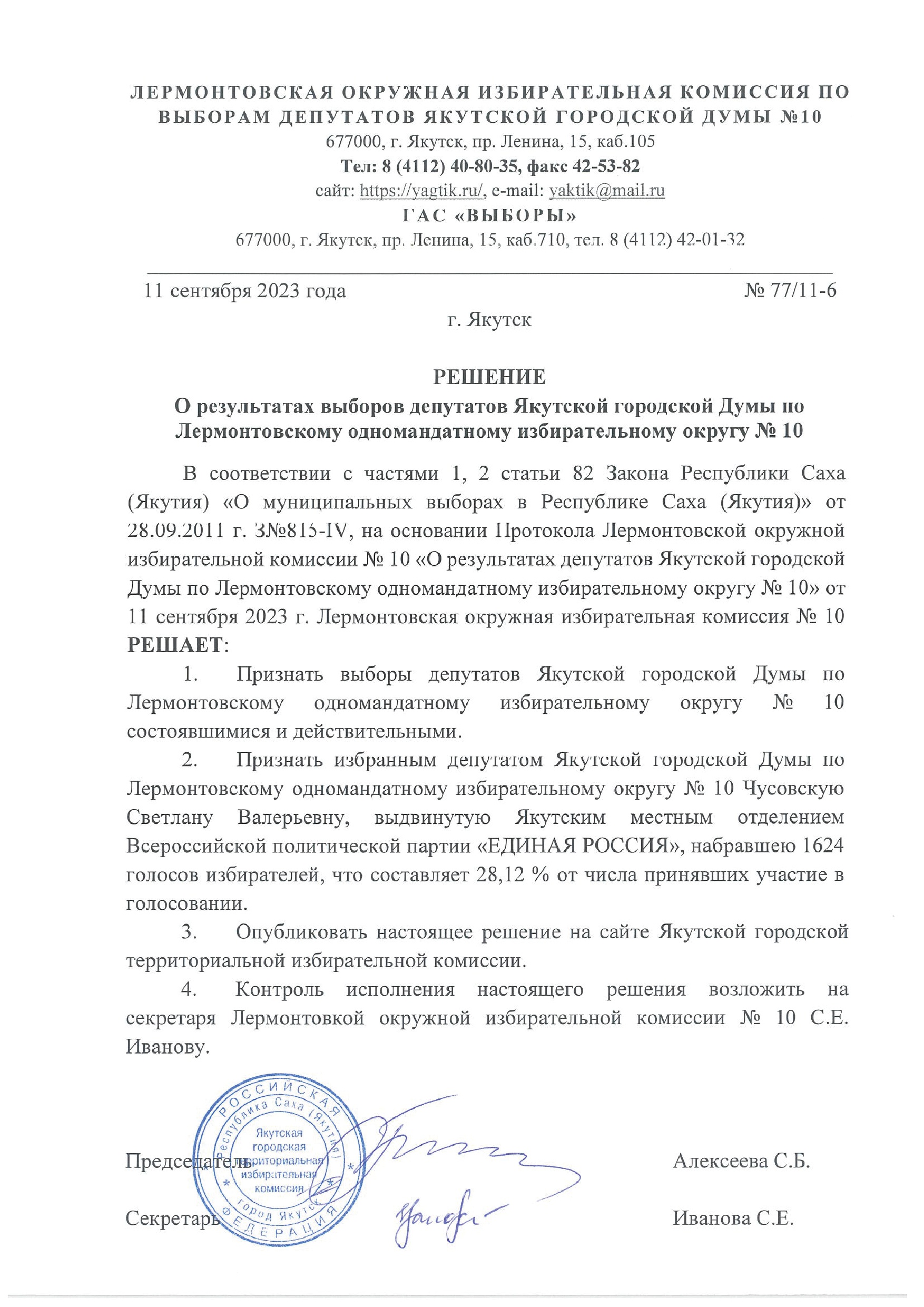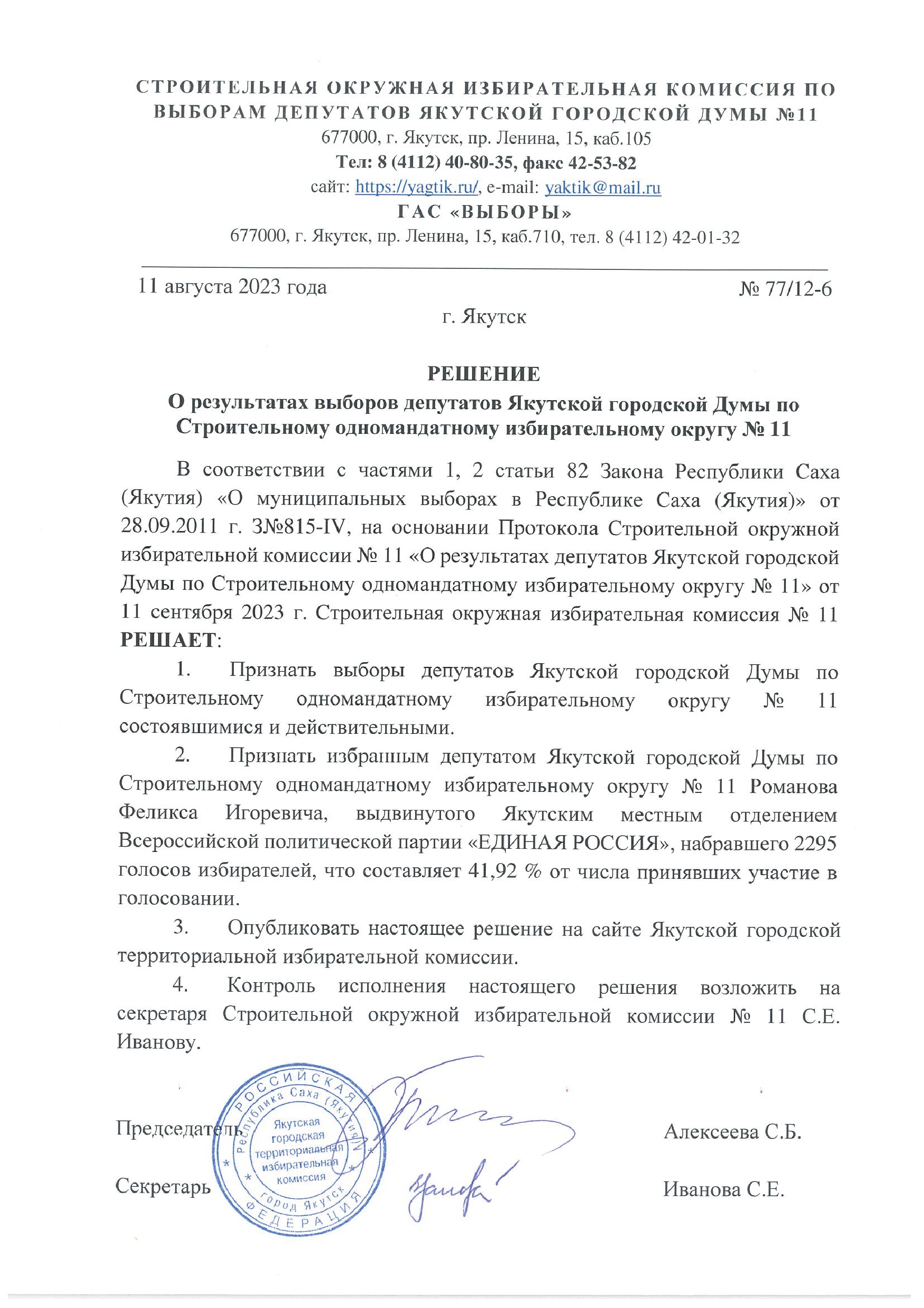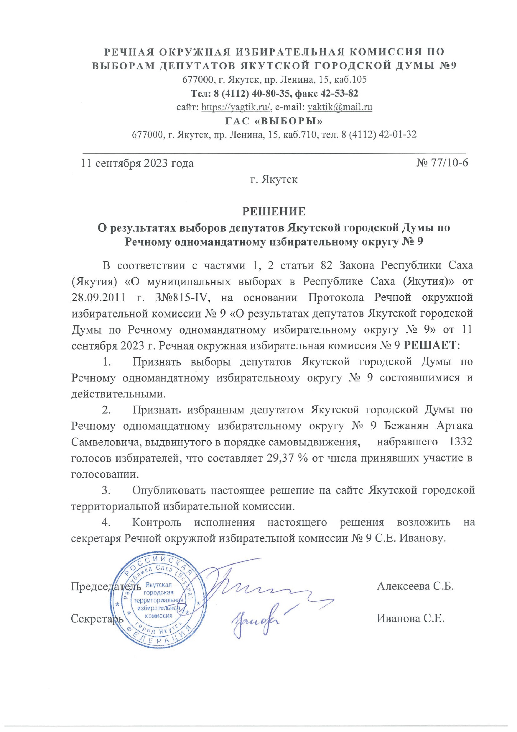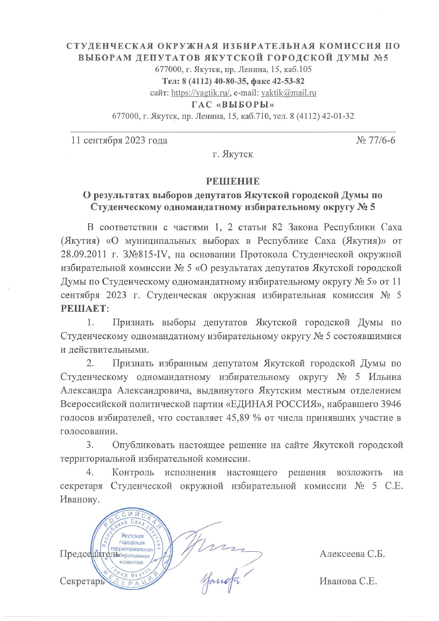 Решения о результатах выборов депутатов Якутской городской Думы по одномандатным избирательным округам