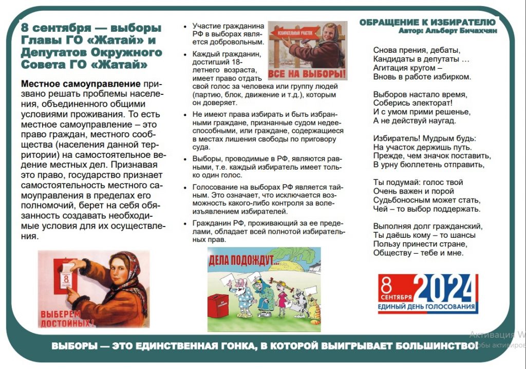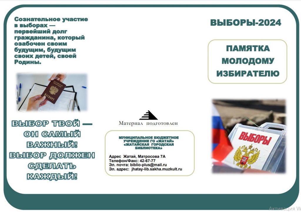 «Жатайская городская библиотека» МБУ ГО «Жатай» для участия во Всероссийском конкурсе среди работников региональных и муниципальных библиотек на лучшую организацию информационно-разъяснительной работы в период подготовки и проведения выборов в органы местного самоуправления в Российской Федерации разработала памятку и видеоролик молодому избирателю.