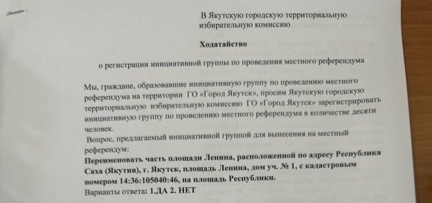 В эти дни рабочая группа Якутской городской территориальной избирательной комиссии – комиссии местного референдума проводит проверку поступившего ходатайства о регистрации инициативной группы по проведению референдума и протокола собрания инициативной группы из числа жителей города Якутска о выдвижении инициативы проведения местного референдума на территории города Якутска о переименовании части площади Ленина, расположенной по адресу Республика Саха (Якутия), г. Якутск, площадь Ленина, дом уч. № 1, с кадастровым номером 14:36:105040:46, на площадь Республики.
