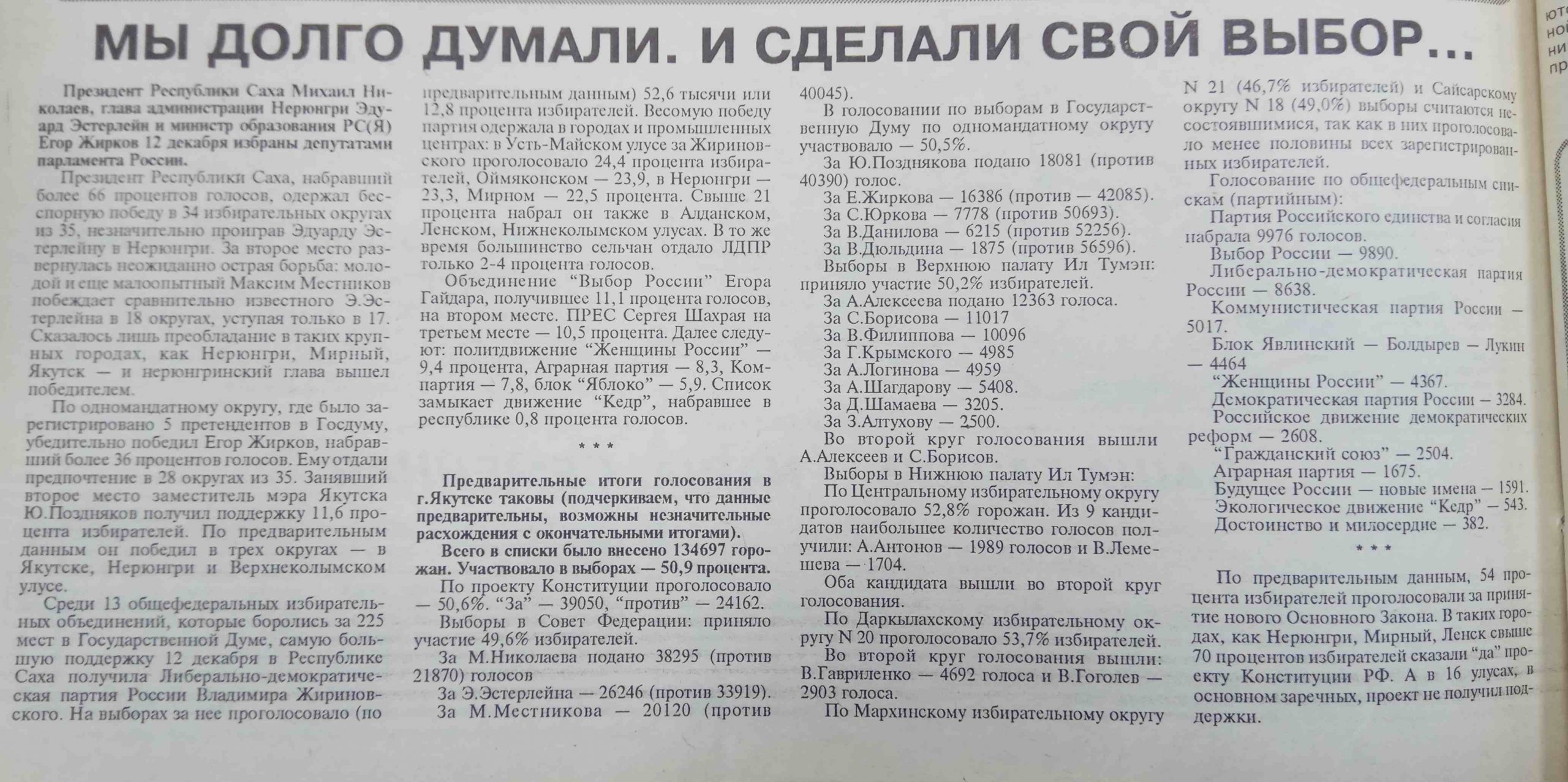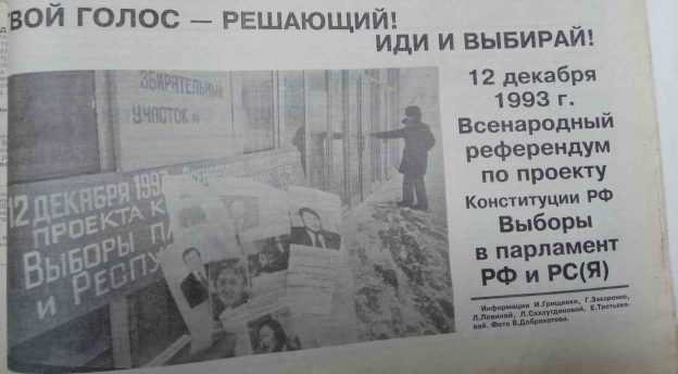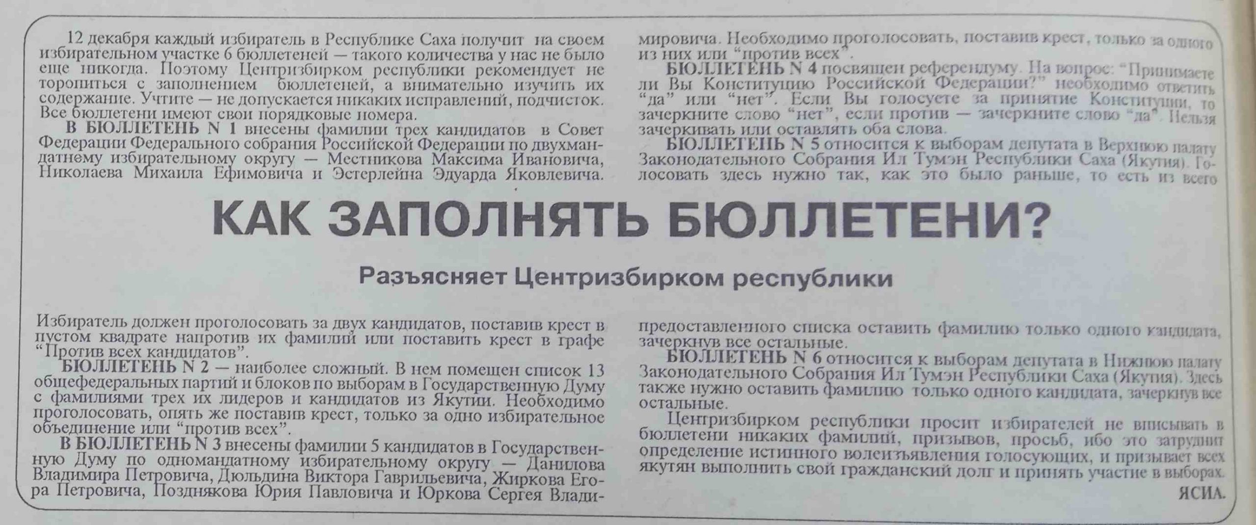 12 декабря 1993 года были очень сложные выборы для якутян, как для избирательных комиссий, так и для избирателей. Каждый избиратель в Республике Саха (Якутия) получил 6 избирательных бюллетеней: