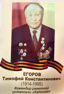 Тимофей Константинович в 1941 году был призван на секретное обучение, после чего стал командиром реактивного миномета «Катюша». С 1942 года служил в 37 армии 42-го гвардейского минометного полка. Он воевал на Северном Кавказе, Кубани, Курске, освобождал Белоруссию и Прибалтику. Дошел до Германии и завершил войну в городе Росток. Старший сержант гвардии — Тимофей был награжден Красным Орденом за «Отвагу». Вернулся на Родину и работал заведующим промышленного хозяйства. Женился и у них родились сын Федя и дочь Люция. Прожил счастливую жизнь до 1998 года в городе Ярославль.