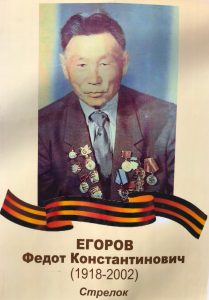 Федот Константинович 1918 года рождения был призван на войну в 1942 году. Работал связистом, воевал начиная от Курска до Прибалтики, дошел до Берлина. Был награжден Орденом за «Отвагу» и медалью «За боевые заслуги». Вернулся в родное село Тойбохой работал председателем рабочей кооперации. У Федота Константиновича было семеро детей.