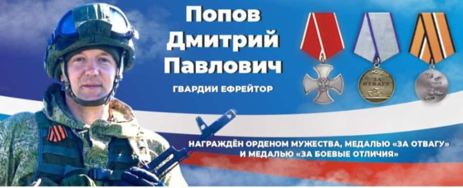 Гвардии ефрейтор в/ч 46102 Попов Дмитрий Павлович, погиб при выполнении боевой задачи 5.06.2023.