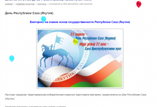 27 апреля 2020 г. ко Дню Республики Саха (Якутия) в городе Якутске прошло много торжественных мероприятий в режиме он-лайн. Якутская городская территориальная избирательная комиссия подготовила и разместила на своем сайте викторину, посвященную этому занимательному событию. Предлагалось решить 12 вопросов. Время для ответов было ограничено. Всего 15 минут. Приняли участие в решении вопросов студенты, школьники, члены.