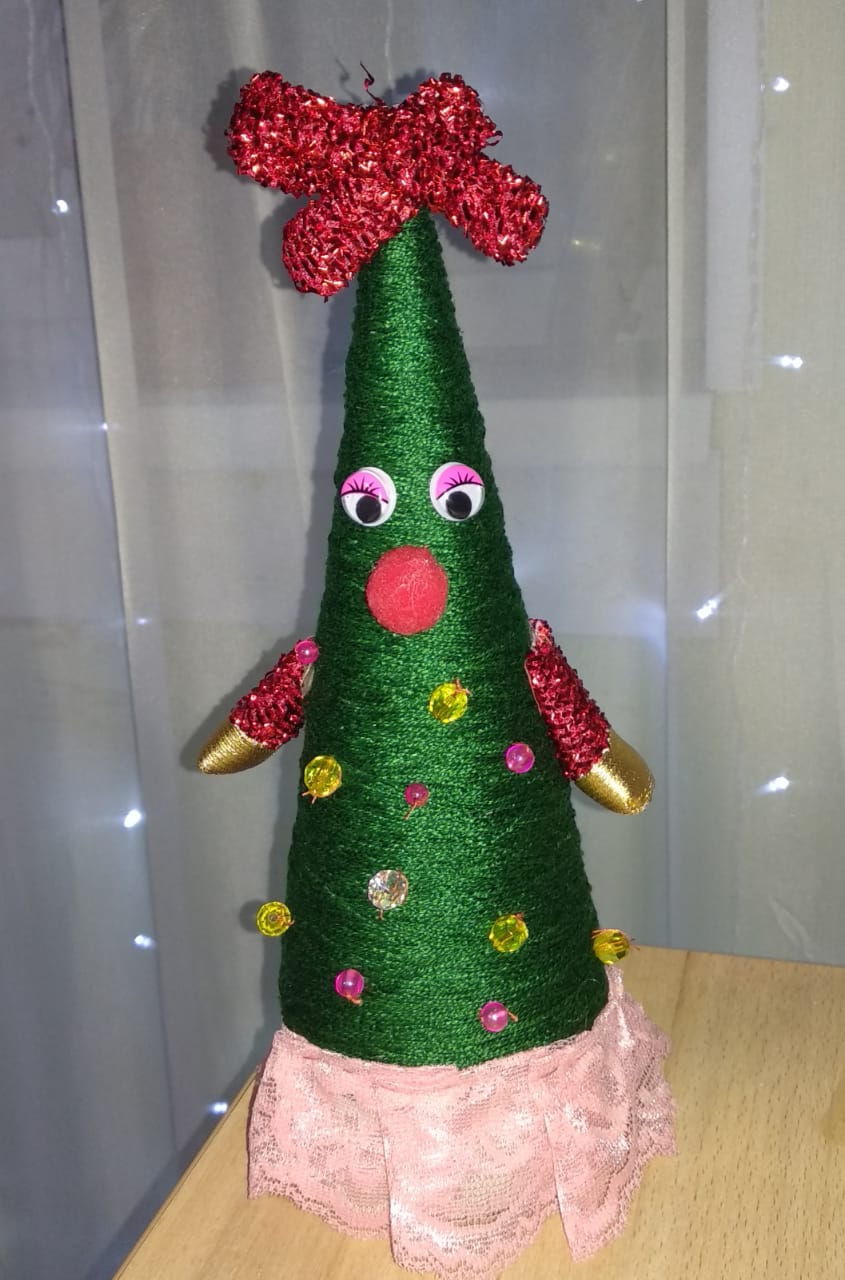 Это самодельная елочка «Спиралька» , сделана из проволоки, обмотанная мишурой на деревянной подножке |