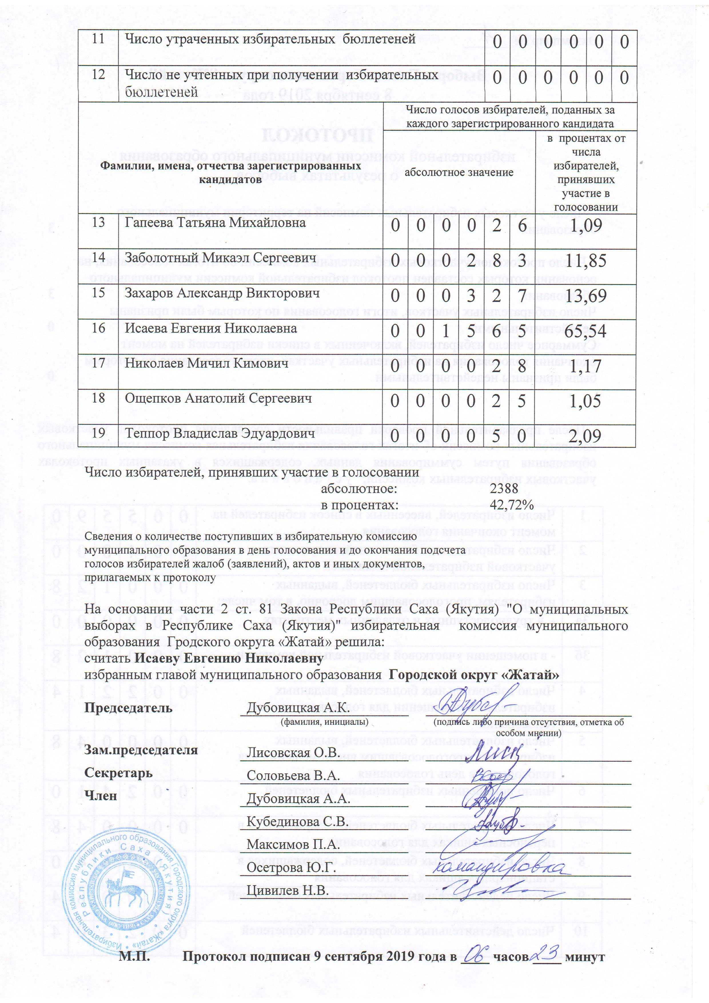 | 7 | ИСАЕВА ЕВГЕНИЯ НИКОЛАЕВНА, дата рождения — 10 апреля 1974 года, уровень образования — высшее, сведения о профессиональном образовании — Новосибирский институт инженеров водного транспорта, 1996 г., основное место работы или службы, занимаемая должность, род занятий — Окружная администрация Городского округа «Жатай», первый заместитель Главы по социальным вопросам и внутренней политике, место жительства — Республика Саха (Якутия), пос.Жатай | самовыдвижение | 18.07.2019 | отм. выдв.