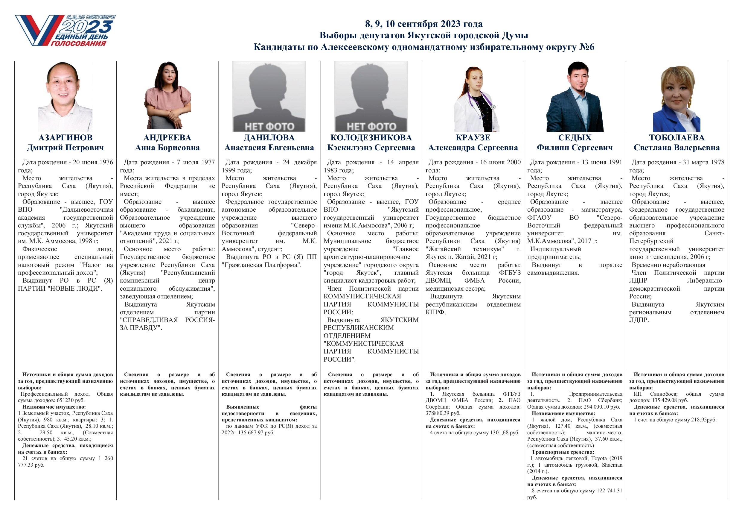 | 6 | СЕДЫХ ФИЛИПП СЕРГЕЕВИЧ, дата рождения — 13 июня 1991 года, уровень образования — высшее образование — магистратура, основное место работы или службы, занимаемая должность, род занятий — индивидуальный предприниматель, место жительства — Республика Саха (Якутия), город Якутск | самовыдвижение | 24.07.2023 | 74 | зарег.