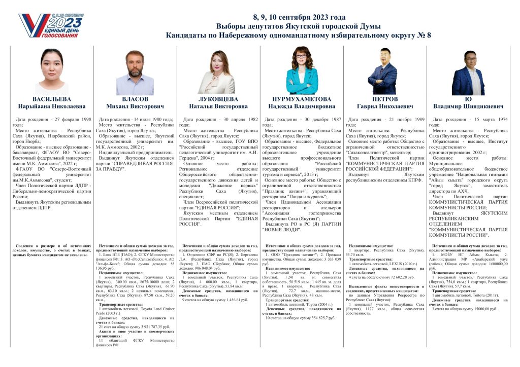 | 2 | ВЛАСОВ МИХАИЛ ВИКТОРОВИЧ, дата рождения — 14 июля 1980 года, уровень образования — высшее, основное место работы или службы, занимаемая должность, род занятий — индивидуальный предприниматель, место жительства — Республика Саха (Якутия), город Якутск | Якутское отделение партии «СПРАВЕДЛИВАЯ РОССИЯ — ЗА ПРАВДУ» | 28.07.2023 | п.п.3-7 ст.35.1 ФЗ «Об основных гарантиях…» № 67-ФЗ | зарег.