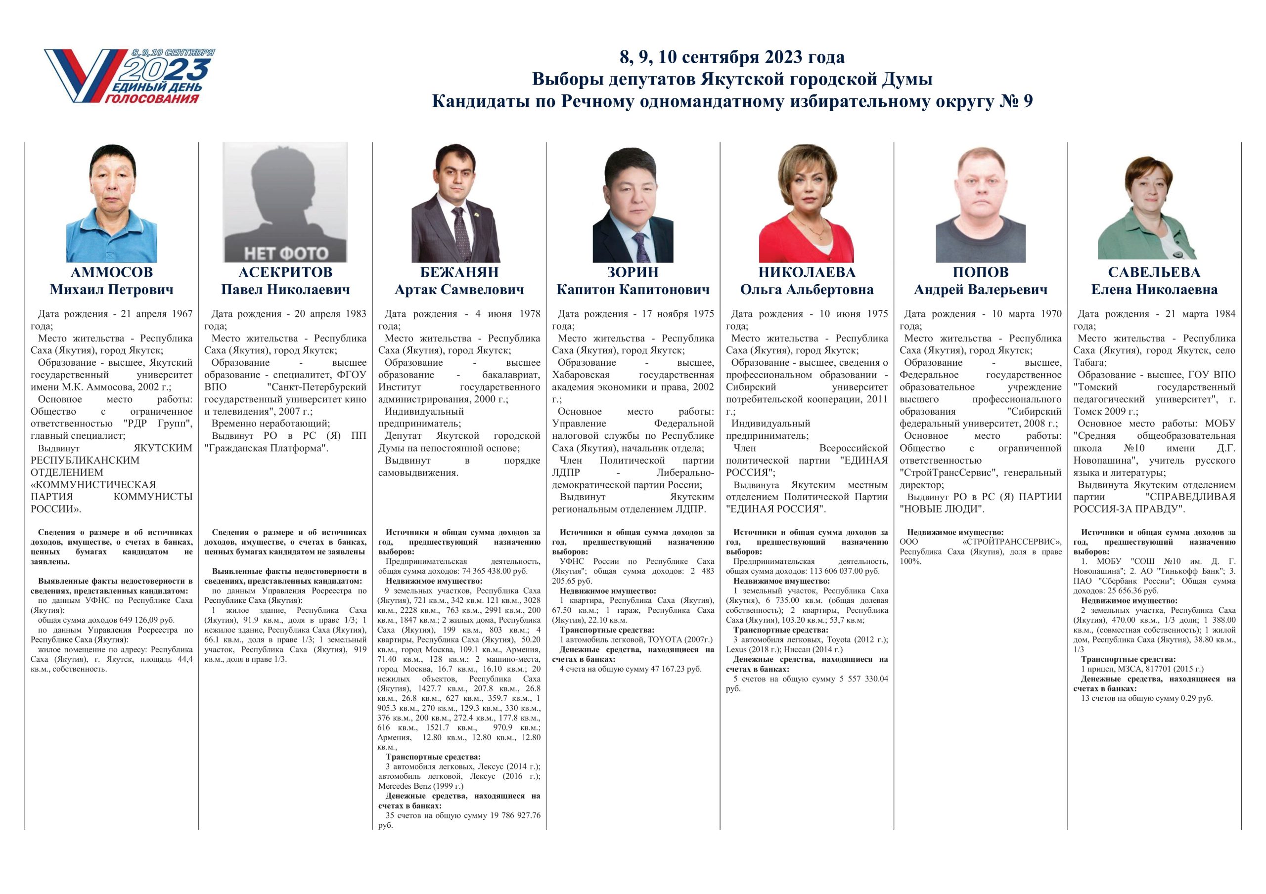 | 1 | АММОСОВ МИХАИЛ ПЕТРОВИЧ, дата рождения — 21 апреля 1967 года, уровень образования — высшее, основное место работы или службы, занимаемая должность, род занятий — Общество с ограниченное ответственностью «РДР Групп», главный специалист, место жительства — Республика Саха (Якутия), город Якутск | ЯКУТСКОЕ РЕСПУБЛИКАНСКОЕ ОТДЕЛЕНИЕ Политической партии КОММУНИСТИЧЕСКАЯ ПАРТИЯ КОММУНИСТЫ РОССИИ | 20.07.2023 | п.п.3-7 ст.35.1 ФЗ «Об основных гарантиях…» № 67-ФЗ | зарег.